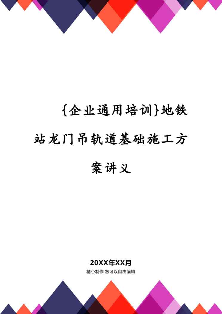 本站资深用户发布了最新的《{企业通用培训}地铁站龙门吊轨道基础施工方案讲义》文档,以下内容为预览,详细内容可下载阅读。 声明:本站所有文章,如无特殊说明或标注,均为本站原创发布。任何个人或组织,在未征得本站同意时,禁止复制、盗用、采集、发布本站内容到任何网站、书籍等各类媒体平台。如若本站内容侵犯了原著者的合法权益,可联系我们进行处理。