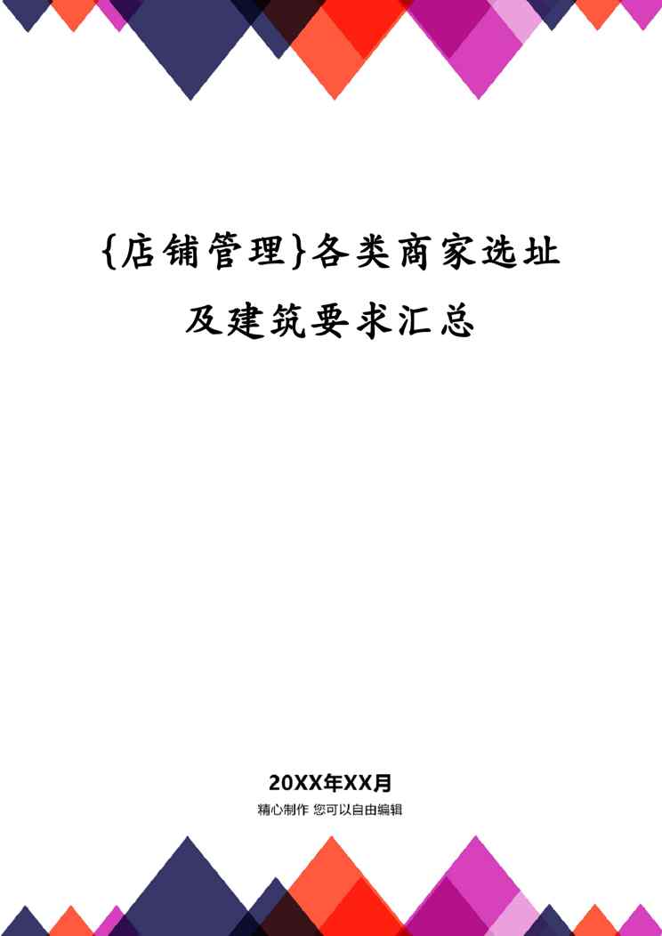 本站正式发布了《{店铺管理}各类商家选址及建筑要求汇总》文档,文档详细内容可下载阅读。 声明:本站所有文章,如无特殊说明或标注,均为本站原创发布。任何个人或组织,在未征得本站同意时,禁止复制、盗用、采集、发布本站内容到任何网站、书籍等各类媒体平台。如若本站内容侵犯了原著者的合法权益,可联系我们进行处理。
