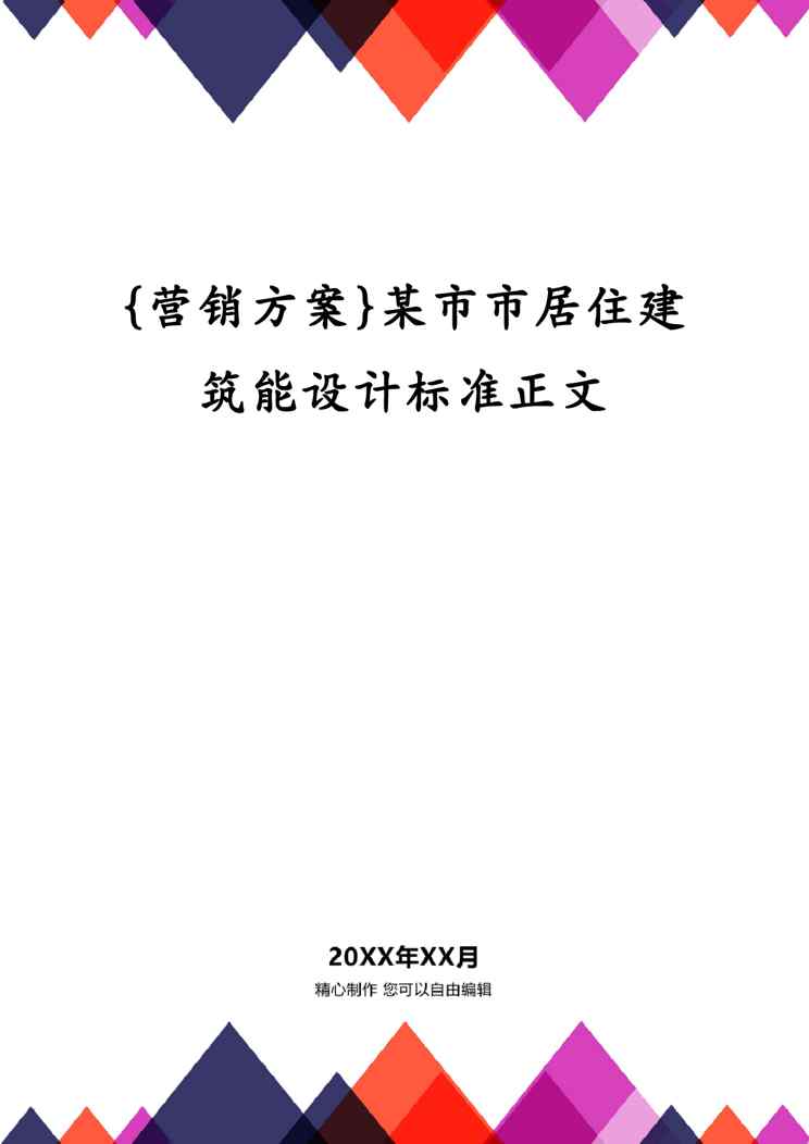 本站资深用户发布了最新的《{营销方案}某市市居住建筑能设计标准正文》文档,以下内容为预览,详细内容可下载阅读。 声明:本站所有文章,如无特殊说明或标注,均为本站原创发布。任何个人或组织,在未征得本站同意时,禁止复制、盗用、采集、发布本站内容到任何网站、书籍等各类媒体平台。如若本站内容侵犯了原著者的合法权益,可联系我们进行处理。