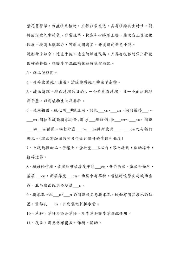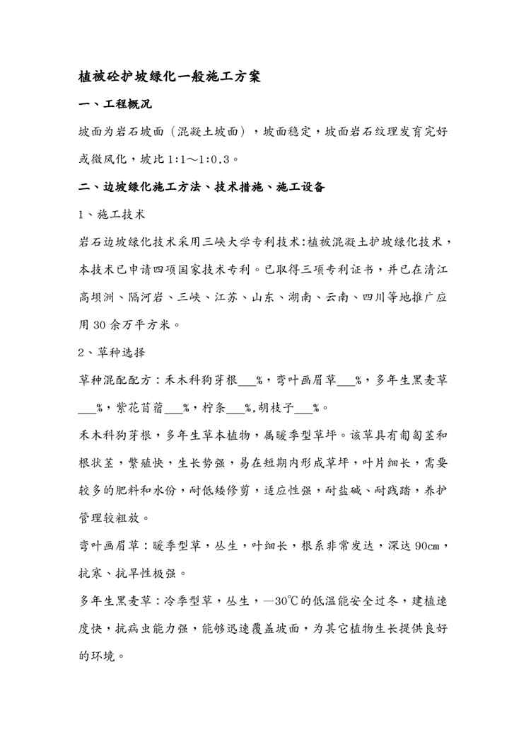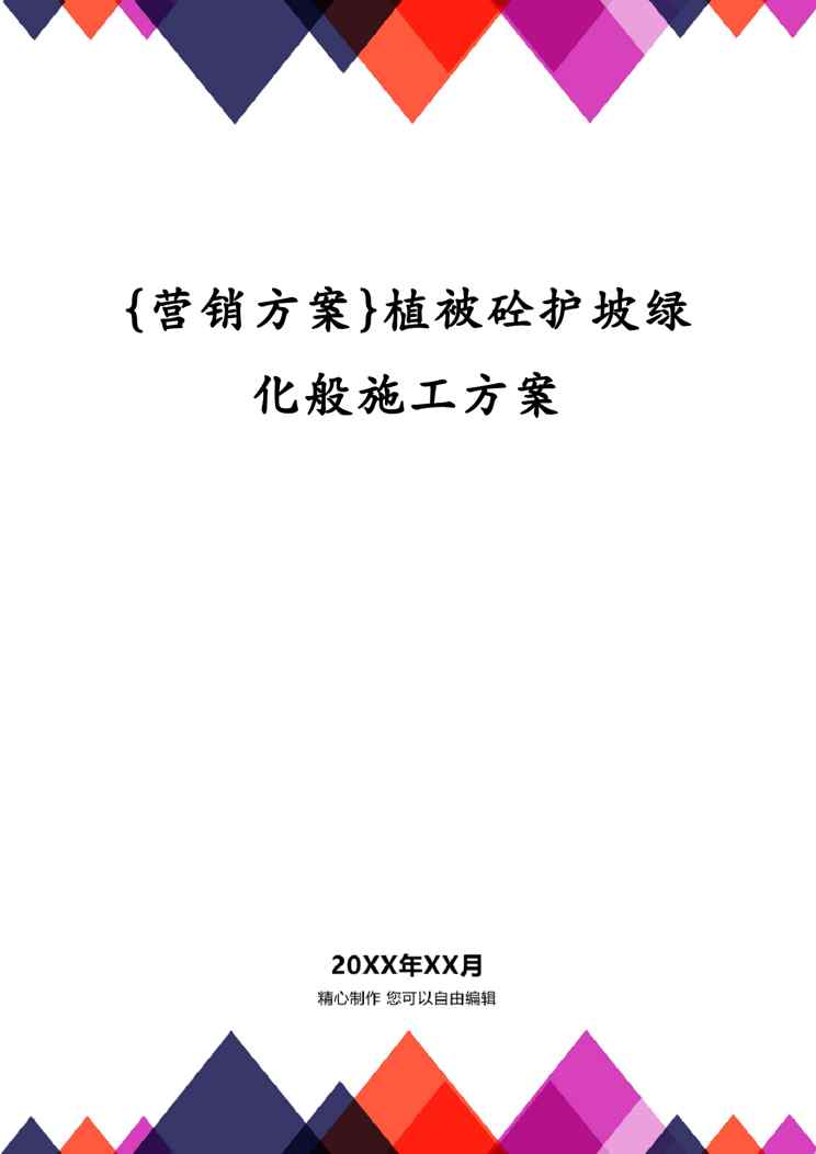 本站资深用户发布了最新的《{营销方案}植被砼护坡绿化般施工方案》文档,以下内容为预览,详细内容可下载阅读。 声明:本站所有文章,如无特殊说明或标注,均为本站原创发布。任何个人或组织,在未征得本站同意时,禁止复制、盗用、采集、发布本站内容到任何网站、书籍等各类媒体平台。如若本站内容侵犯了原著者的合法权益,可联系我们进行处理。