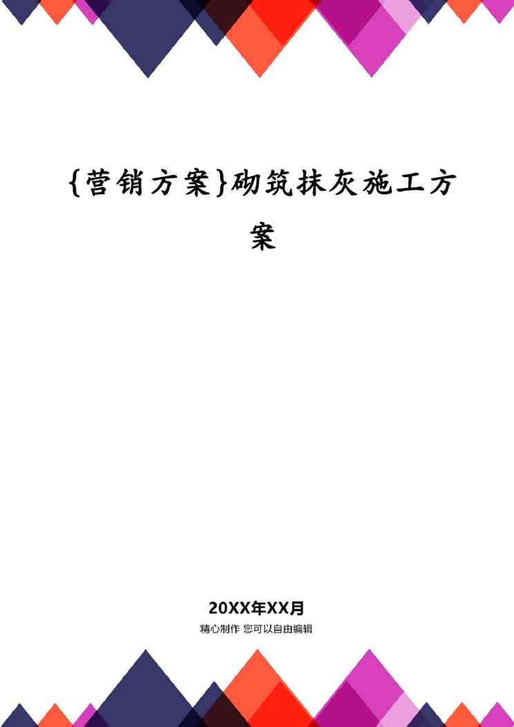 本站正式发布了《{营销方案}砌筑抹灰施工方案》文档,文档详细内容可下载阅读。 声明:本站所有文章,如无特殊说明或标注,均为本站原创发布。任何个人或组织,在未征得本站同意时,禁止复制、盗用、采集、发布本站内容到任何网站、书籍等各类媒体平台。如若本站内容侵犯了原著者的合法权益,可联系我们进行处理。