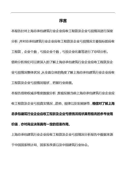 本站资深用户发布了最新的《2018版上海总承包建筑行业企业应收工程款及企业亏损情况分析报告》文档,以下内容为预览,详细内容可下载阅读。 声明:本站所有文章,如无特殊说明或标注,均为本站原创发布。任何个人或组织,在未征得本站同意时,禁止复制、盗用、采集、发布本站内容到任何网站、书籍等各类媒体平台。如若本站内容侵犯了原著者的合法权益,可联系我们进行处理。
