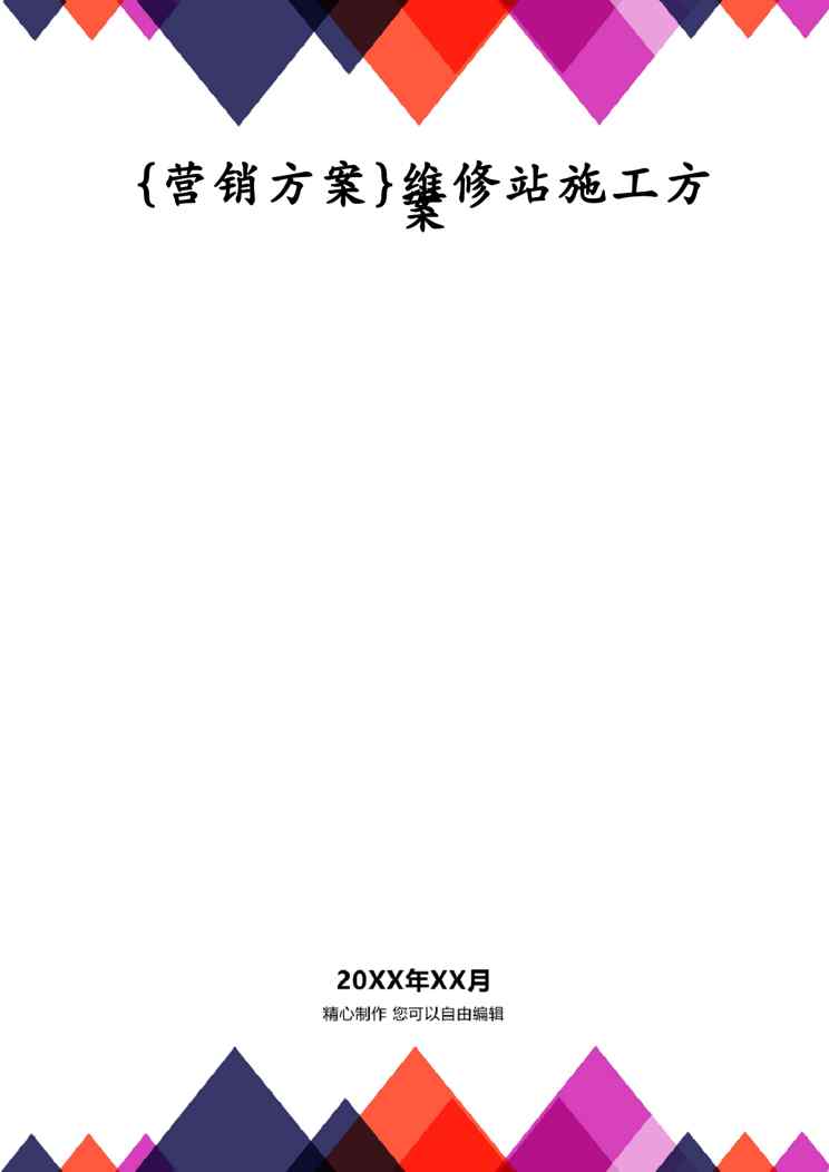 本站正式发布了《{营销方案}维修站施工方案》文档,文档详细内容可下载阅读。 声明:本站所有文章,如无特殊说明或标注,均为本站原创发布。任何个人或组织,在未征得本站同意时,禁止复制、盗用、采集、发布本站内容到任何网站、书籍等各类媒体平台。如若本站内容侵犯了原著者的合法权益,可联系我们进行处理。