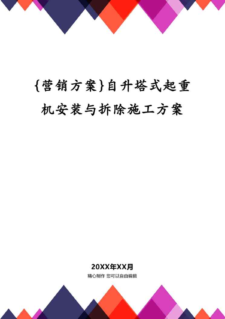 本站资深用户发布了最新的《{营销方案}自升塔式起重机安装与拆除施工方案》文档,以下内容为预览,详细内容可下载阅读。 声明:本站所有文章,如无特殊说明或标注,均为本站原创发布。任何个人或组织,在未征得本站同意时,禁止复制、盗用、采集、发布本站内容到任何网站、书籍等各类媒体平台。如若本站内容侵犯了原著者的合法权益,可联系我们进行处理。