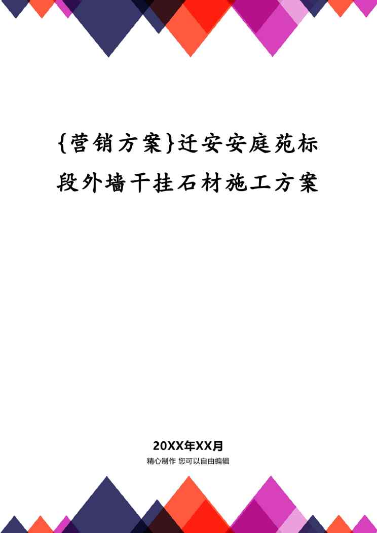 不久前,最新文档《{营销方案}迁安安庭苑标段外墙干挂石材施工方案》全文正式在本站发布,感兴趣的用户可以下载阅读。 声明:本站所有文章,如无特殊说明或标注,均为本站原创发布。任何个人或组织,在未征得本站同意时,禁止复制、盗用、采集、发布本站内容到任何网站、书籍等各类媒体平台。如若本站内容侵犯了原著者的合法权益,可联系我们进行处理。