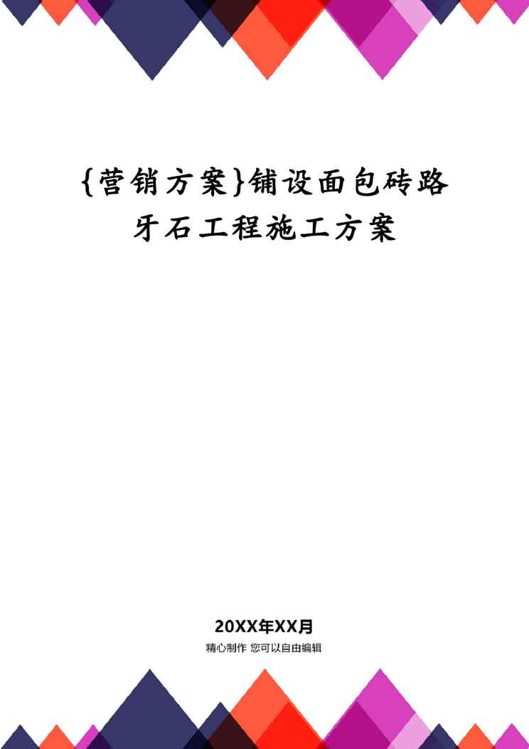 本站正式发布了《{营销方案}铺设面包砖路牙石工程施工方案》文档,文档详细内容可下载阅读。 声明:本站所有文章,如无特殊说明或标注,均为本站原创发布。任何个人或组织,在未征得本站同意时,禁止复制、盗用、采集、发布本站内容到任何网站、书籍等各类媒体平台。如若本站内容侵犯了原著者的合法权益,可联系我们进行处理。