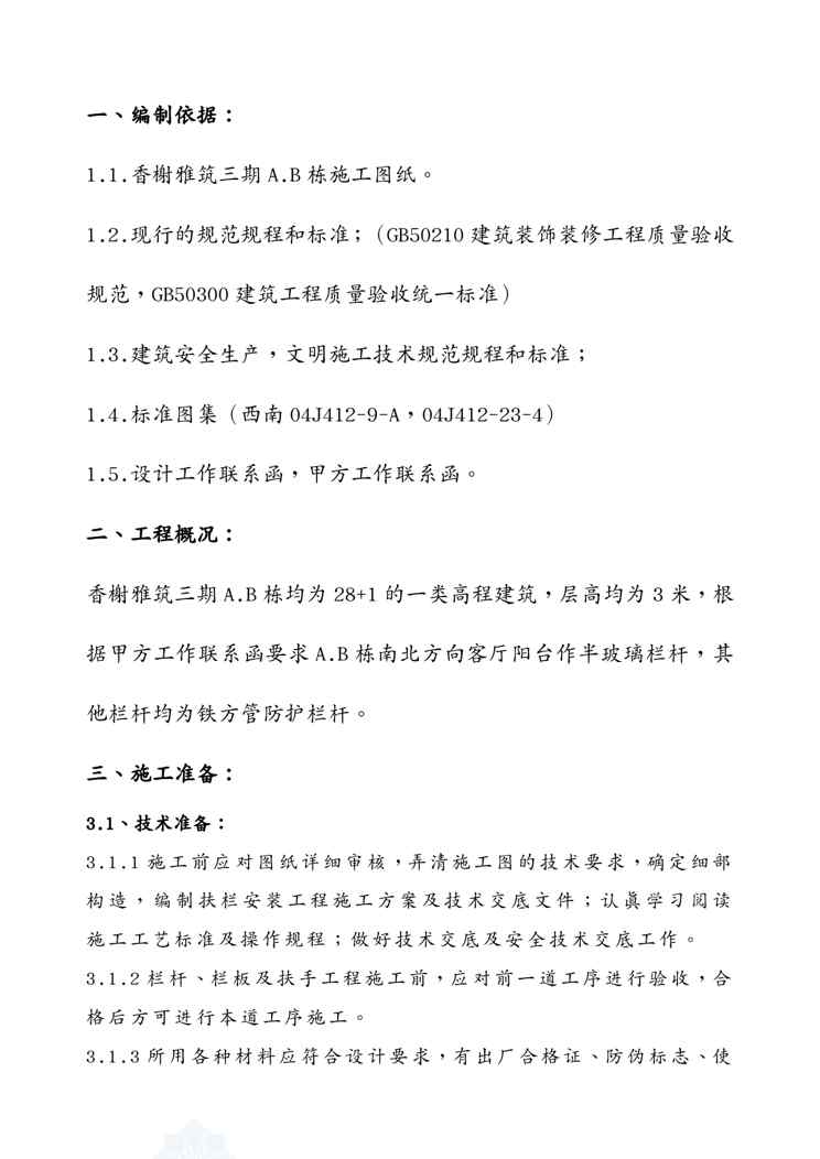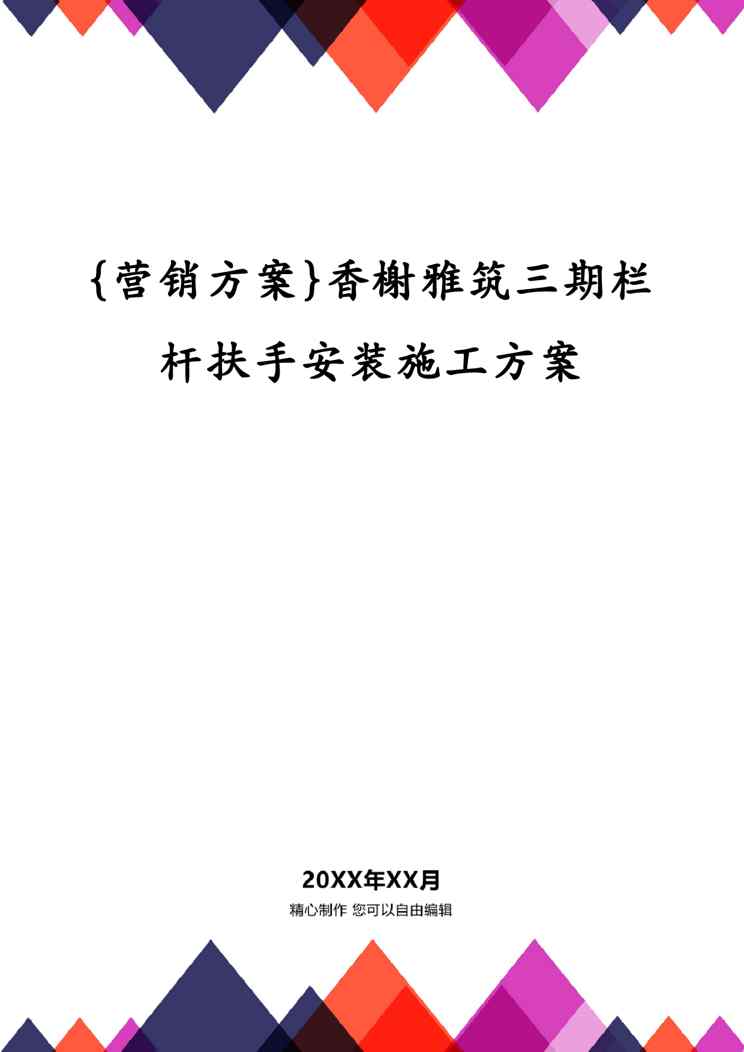 不久前,最新文档《{营销方案}香榭雅筑三期栏杆扶手安装施工方案》全文正式在本站发布,感兴趣的用户可以下载阅读。 声明:本站所有文章,如无特殊说明或标注,均为本站原创发布。任何个人或组织,在未征得本站同意时,禁止复制、盗用、采集、发布本站内容到任何网站、书籍等各类媒体平台。如若本站内容侵犯了原著者的合法权益,可联系我们进行处理。