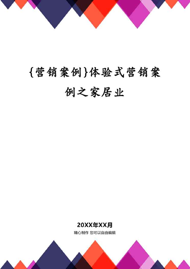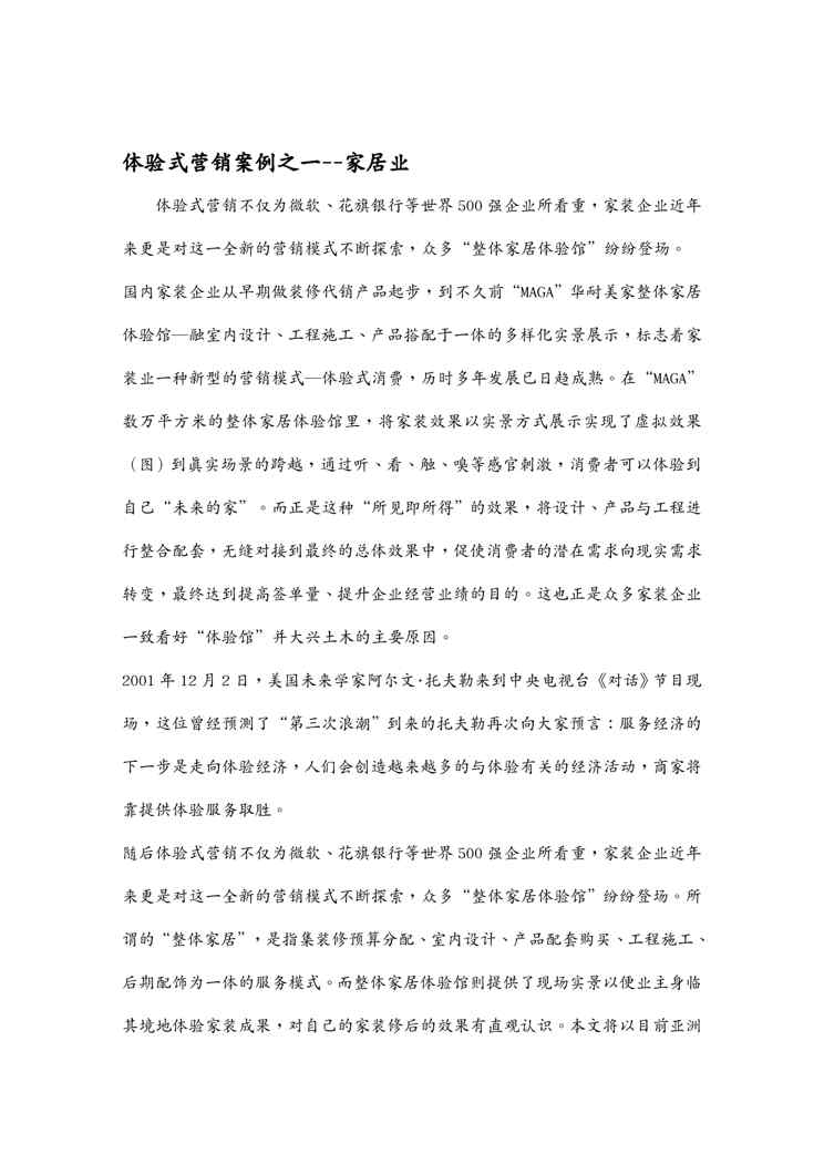 本站资深用户发布了最新的《{营销案例}体验式营销案例之家居业》文档,以下内容为预览,详细内容可下载阅读。 声明:本站所有文章,如无特殊说明或标注,均为本站原创发布。任何个人或组织,在未征得本站同意时,禁止复制、盗用、采集、发布本站内容到任何网站、书籍等各类媒体平台。如若本站内容侵犯了原著者的合法权益,可联系我们进行处理。