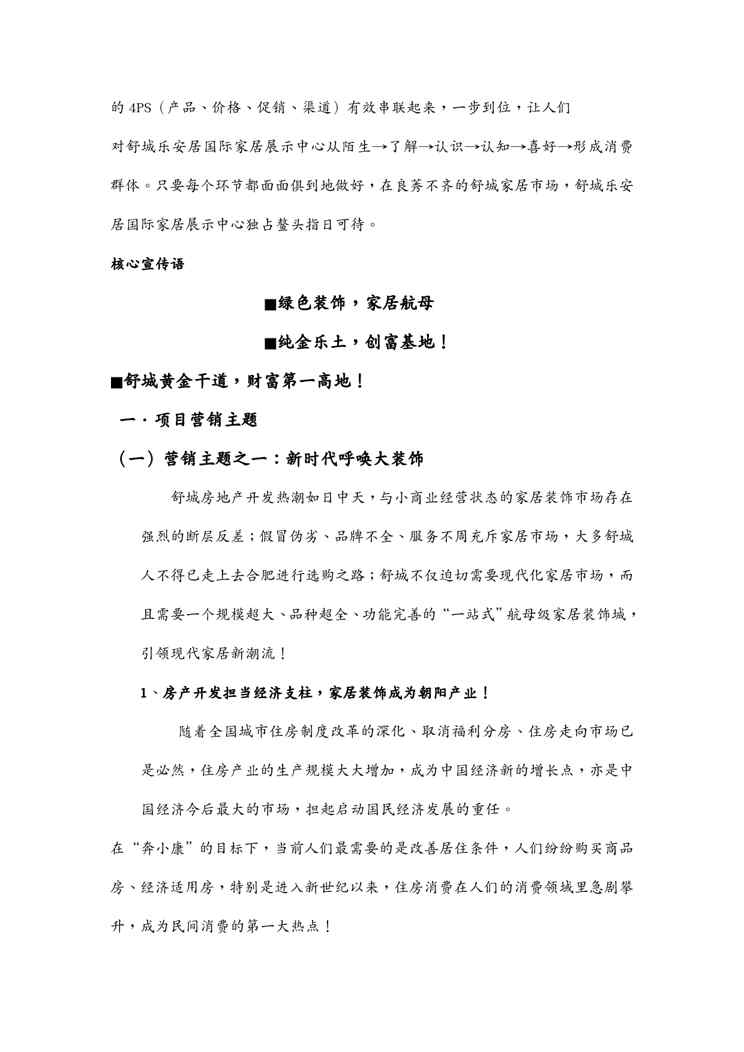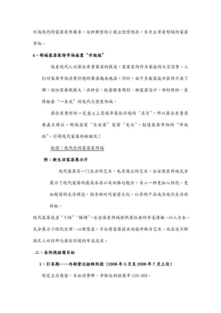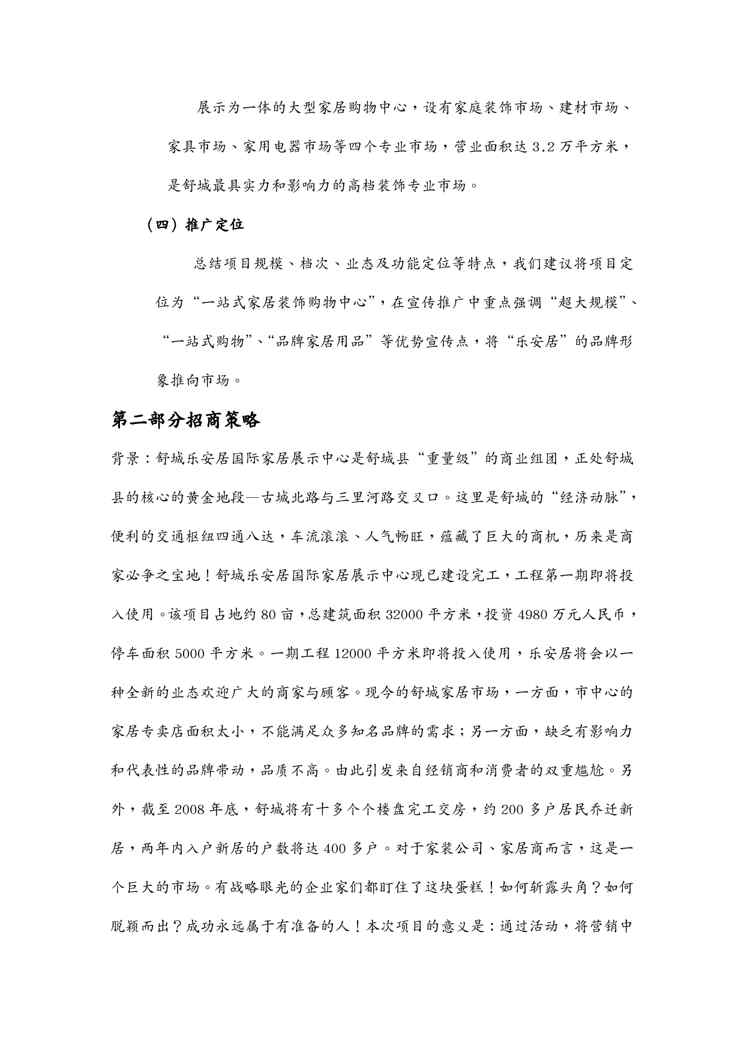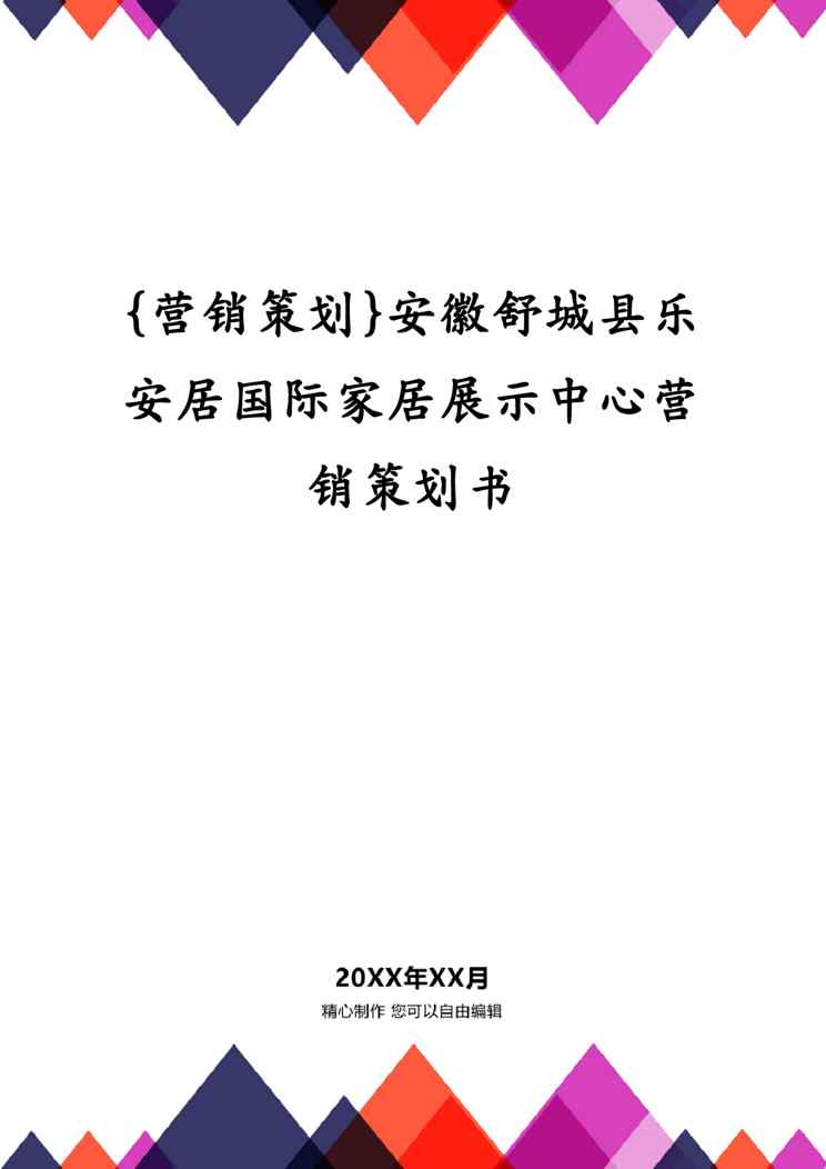 本站资深用户发布了最新的《{营销策划}安徽舒城县乐安居国际家居展示中心营销策划书》文档,以下内容为预览,详细内容可下载阅读。 声明:本站所有文章,如无特殊说明或标注,均为本站原创发布。任何个人或组织,在未征得本站同意时,禁止复制、盗用、采集、发布本站内容到任何网站、书籍等各类媒体平台。如若本站内容侵犯了原著者的合法权益,可联系我们进行处理。