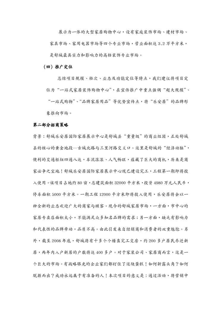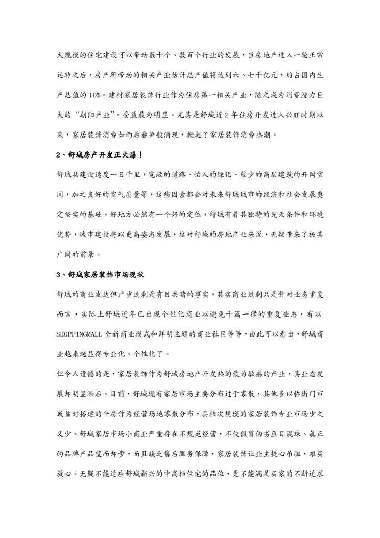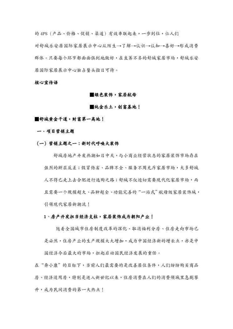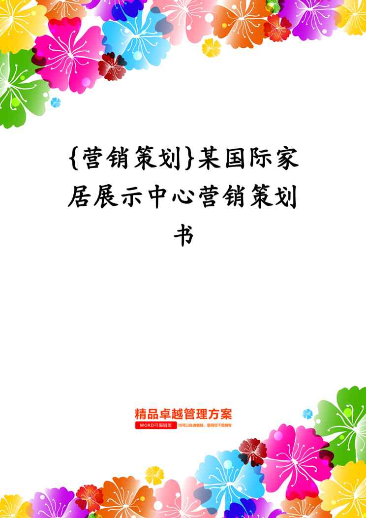 本站资深用户发布了最新的《{营销策划}某国际家居展示中心营销策划书》文档,以下内容为预览,详细内容可下载阅读。 声明:本站所有文章,如无特殊说明或标注,均为本站原创发布。任何个人或组织,在未征得本站同意时,禁止复制、盗用、采集、发布本站内容到任何网站、书籍等各类媒体平台。如若本站内容侵犯了原著者的合法权益,可联系我们进行处理。