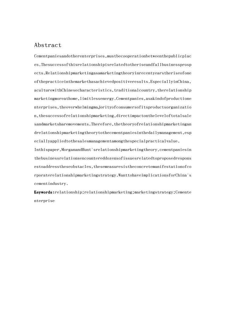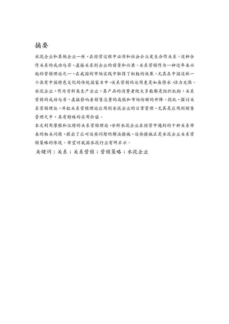 本站资深用户发布了最新的《{营销策略}我国水泥企业的关系营销策略》文档,以下内容为预览,详细内容可下载阅读。 声明:本站所有文章,如无特殊说明或标注,均为本站原创发布。任何个人或组织,在未征得本站同意时,禁止复制、盗用、采集、发布本站内容到任何网站、书籍等各类媒体平台。如若本站内容侵犯了原著者的合法权益,可联系我们进行处理。