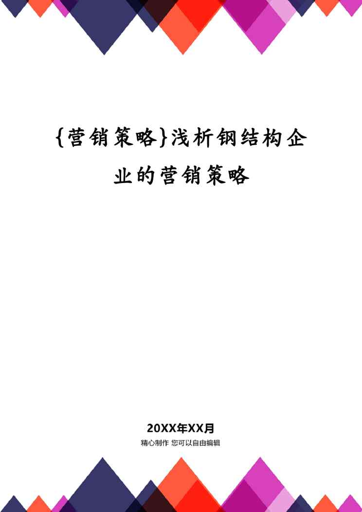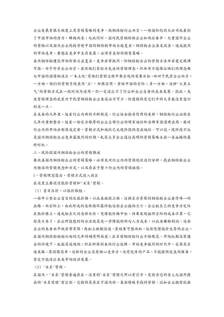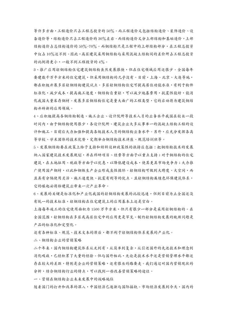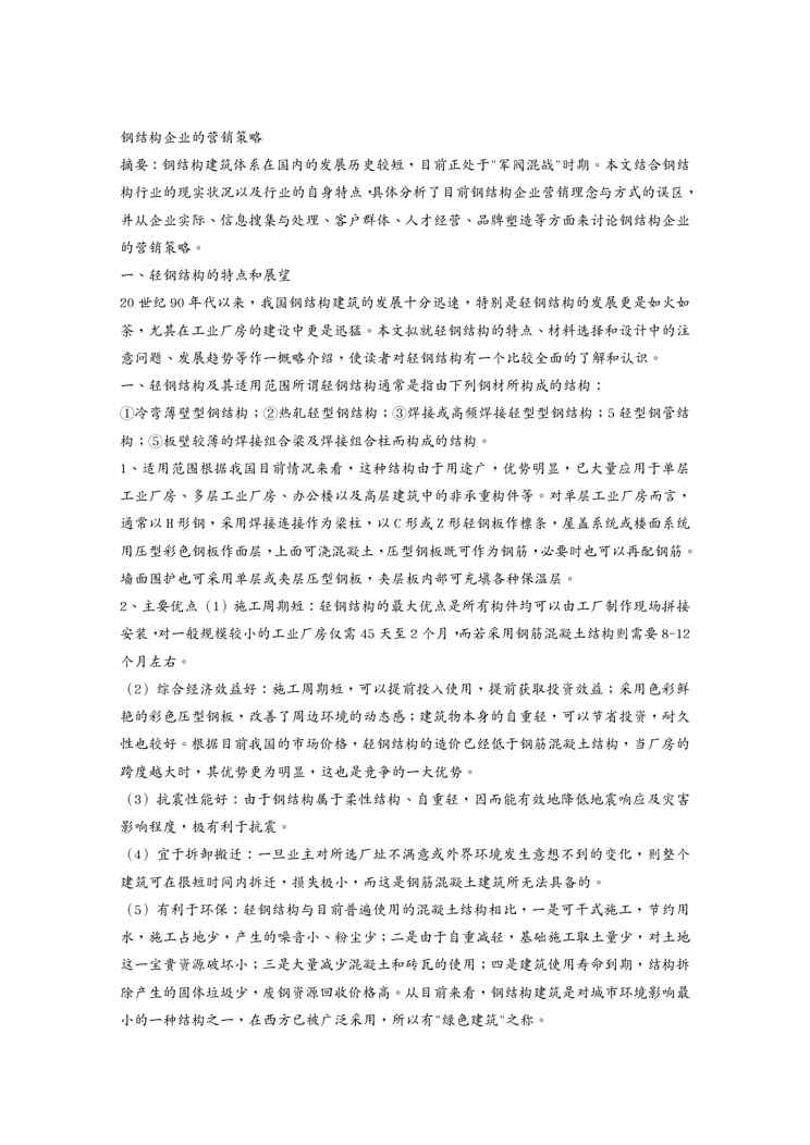不久前,最新文档《{营销策略}浅析钢结构企业的营销策略》全文正式在本站发布,感兴趣的用户可以下载阅读。 声明:本站所有文章,如无特殊说明或标注,均为本站原创发布。任何个人或组织,在未征得本站同意时,禁止复制、盗用、采集、发布本站内容到任何网站、书籍等各类媒体平台。如若本站内容侵犯了原著者的合法权益,可联系我们进行处理。