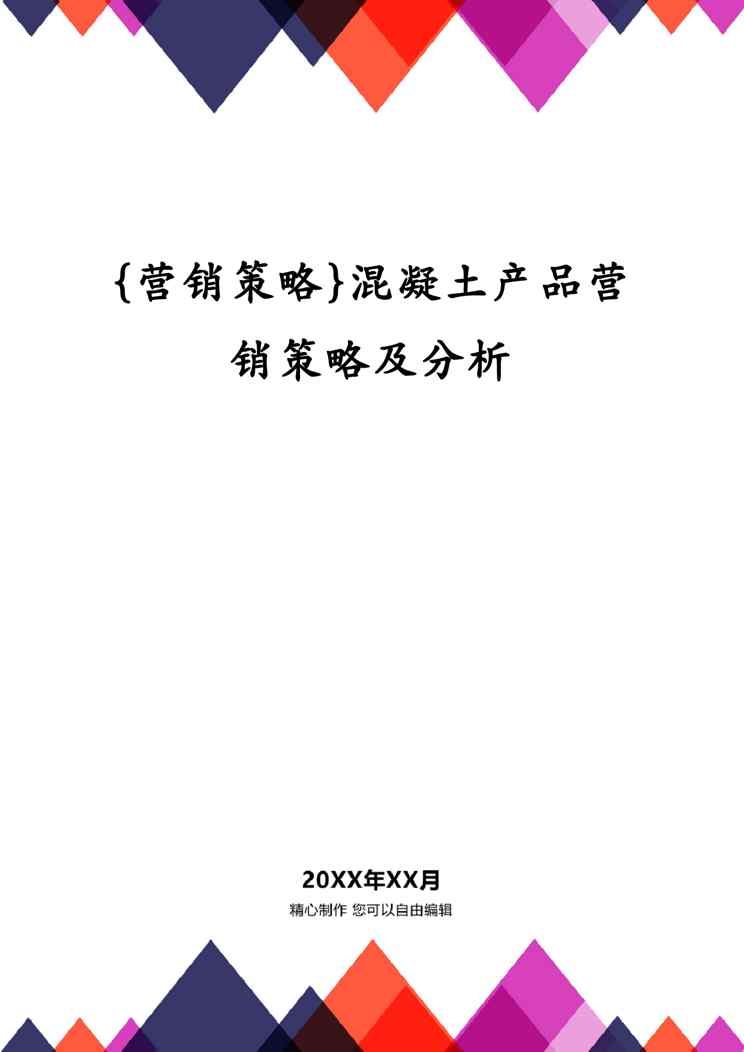 本站资深用户发布了最新的《{营销策略}混凝土产品营销策略及分析》文档,以下内容为预览,详细内容可下载阅读。 声明:本站所有文章,如无特殊说明或标注,均为本站原创发布。任何个人或组织,在未征得本站同意时,禁止复制、盗用、采集、发布本站内容到任何网站、书籍等各类媒体平台。如若本站内容侵犯了原著者的合法权益,可联系我们进行处理。
