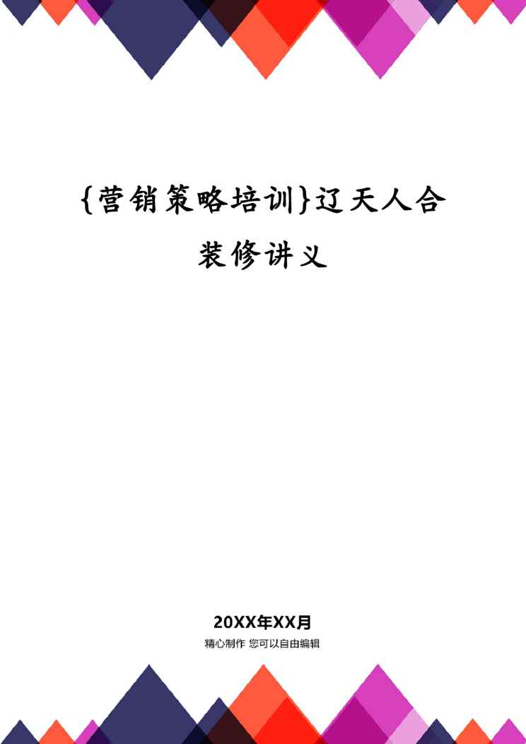 本站正式发布了《{营销策略培训}辽天人合装修讲义》文档,文档详细内容可下载阅读。 声明:本站所有文章,如无特殊说明或标注,均为本站原创发布。任何个人或组织,在未征得本站同意时,禁止复制、盗用、采集、发布本站内容到任何网站、书籍等各类媒体平台。如若本站内容侵犯了原著者的合法权益,可联系我们进行处理。
