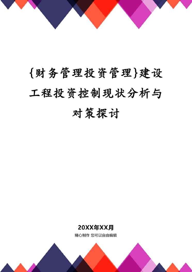 本站资深用户发布了最新的《{财务管理投资管理}建设工程投资控制现状分析与对策探讨》文档,以下内容为预览,详细内容可下载阅读。 声明:本站所有文章,如无特殊说明或标注,均为本站原创发布。任何个人或组织,在未征得本站同意时,禁止复制、盗用、采集、发布本站内容到任何网站、书籍等各类媒体平台。如若本站内容侵犯了原著者的合法权益,可联系我们进行处理。