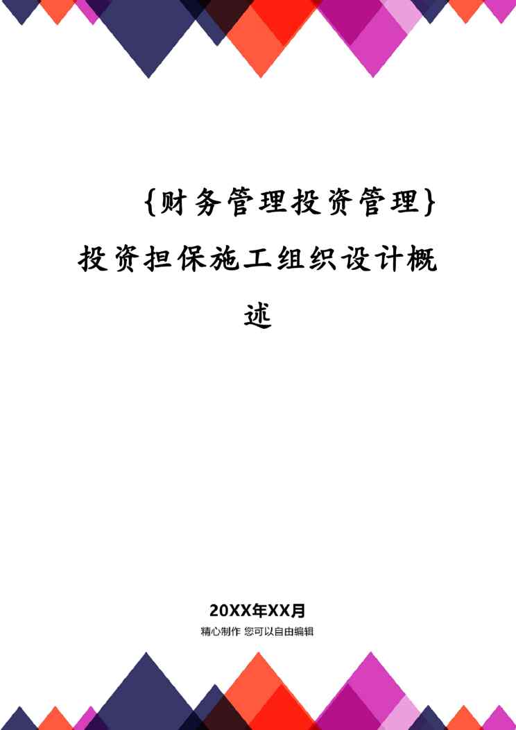 本站资深用户发布了最新的《{财务管理投资管理}投资担保施工组织设计概述》文档,以下内容为预览,详细内容可下载阅读。 声明:本站所有文章,如无特殊说明或标注,均为本站原创发布。任何个人或组织,在未征得本站同意时,禁止复制、盗用、采集、发布本站内容到任何网站、书籍等各类媒体平台。如若本站内容侵犯了原著者的合法权益,可联系我们进行处理。