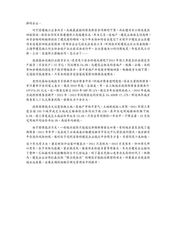 本站资深用户发布了最新的《{财务管理盘点管理}中国建筑业某某某之热点大盘点》文档,以下内容为预览,详细内容可下载阅读。 声明:本站所有文章,如无特殊说明或标注,均为本站原创发布。任何个人或组织,在未征得本站同意时,禁止复制、盗用、采集、发布本站内容到任何网站、书籍等各类媒体平台。如若本站内容侵犯了原著者的合法权益,可联系我们进行处理。