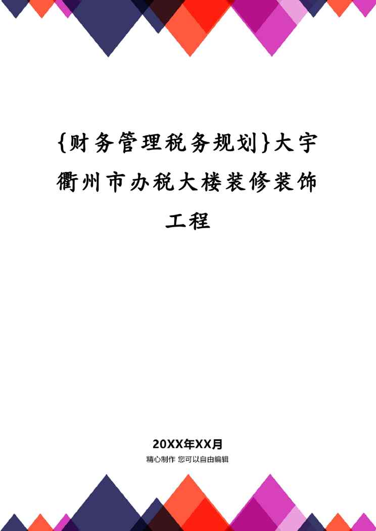 本站资深用户发布了最新的《{财务管理税务规划}大宇衢州市办税大楼装修装饰工程》文档,以下内容为预览,详细内容可下载阅读。 声明:本站所有文章,如无特殊说明或标注,均为本站原创发布。任何个人或组织,在未征得本站同意时,禁止复制、盗用、采集、发布本站内容到任何网站、书籍等各类媒体平台。如若本站内容侵犯了原著者的合法权益,可联系我们进行处理。