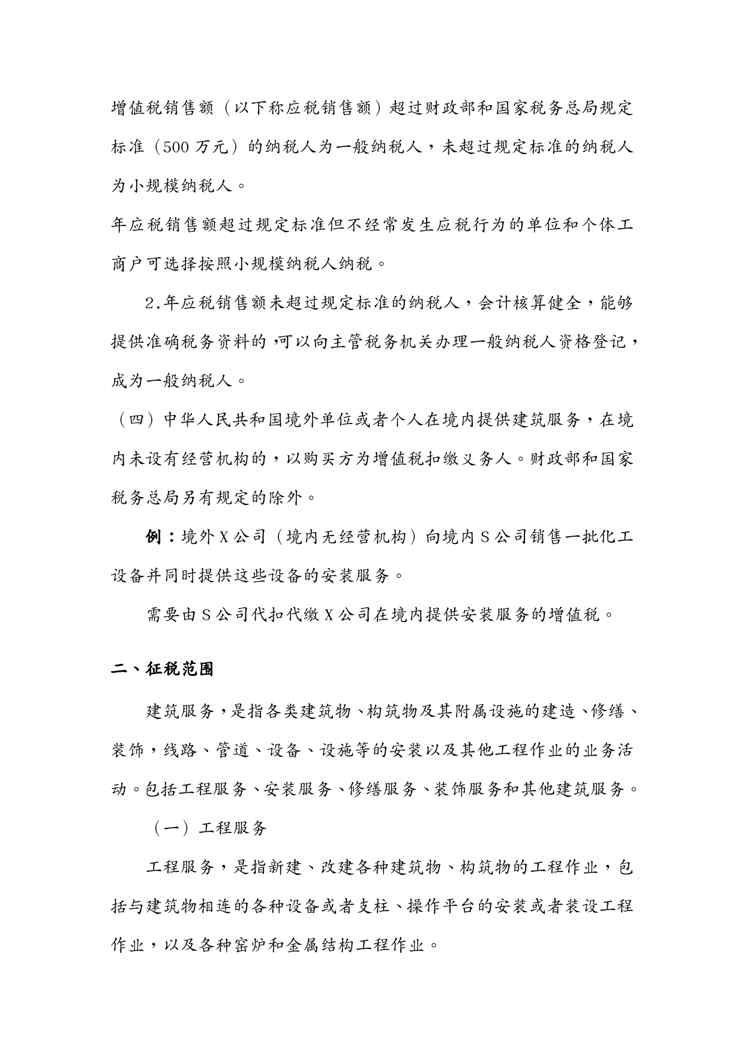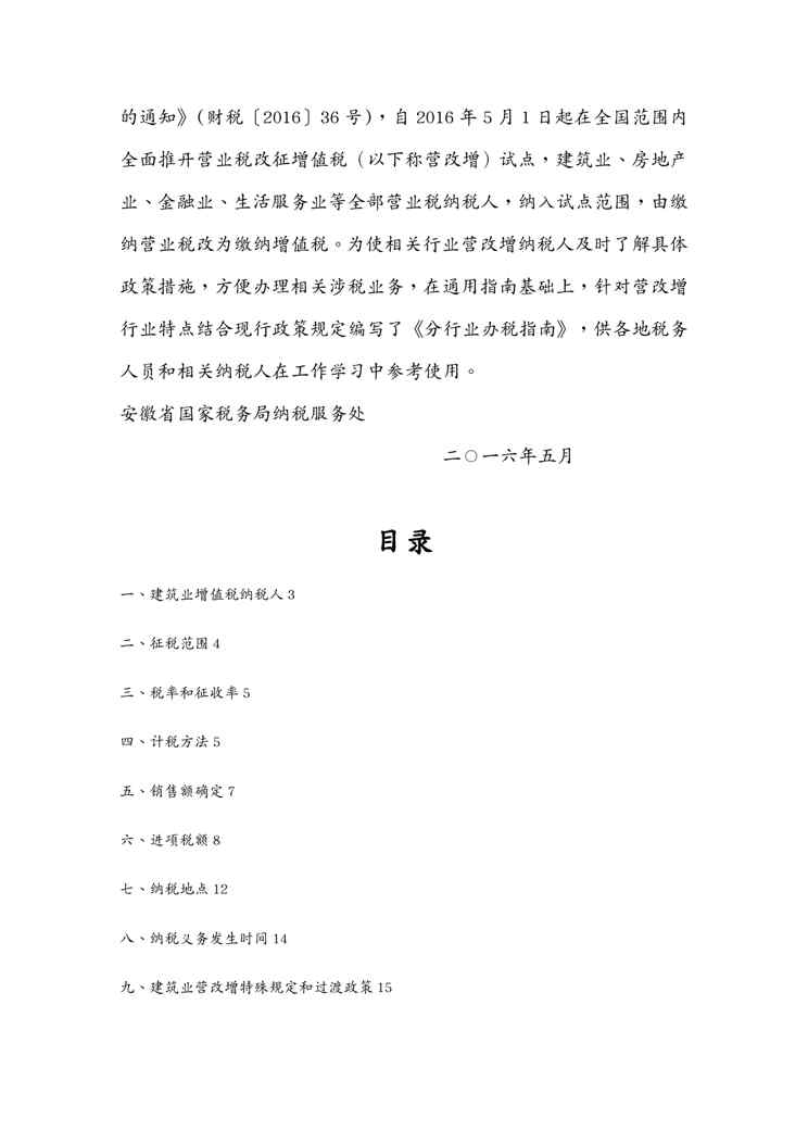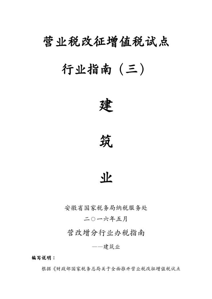 不久前,最新文档《{财务管理税务规划}建筑业营改增办税指南》全文正式在本站发布,感兴趣的用户可以下载阅读。 声明:本站所有文章,如无特殊说明或标注,均为本站原创发布。任何个人或组织,在未征得本站同意时,禁止复制、盗用、采集、发布本站内容到任何网站、书籍等各类媒体平台。如若本站内容侵犯了原著者的合法权益,可联系我们进行处理。