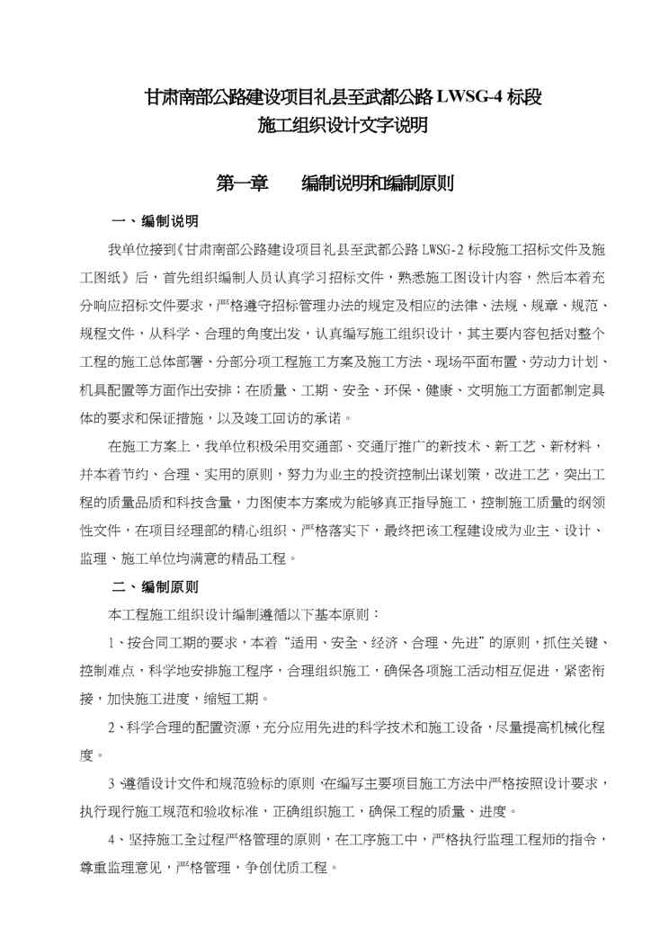 本站资深用户发布了最新的《{项目管理项目报告}公路建设项目礼县至武都公路LWSG4标段施工组织设计》文档,以下内容为预览,详细内容可下载阅读。 声明:本站所有文章,如无特殊说明或标注,均为本站原创发布。任何个人或组织,在未征得本站同意时,禁止复制、盗用、采集、发布本站内容到任何网站、书籍等各类媒体平台。如若本站内容侵犯了原著者的合法权益,可联系我们进行处理。