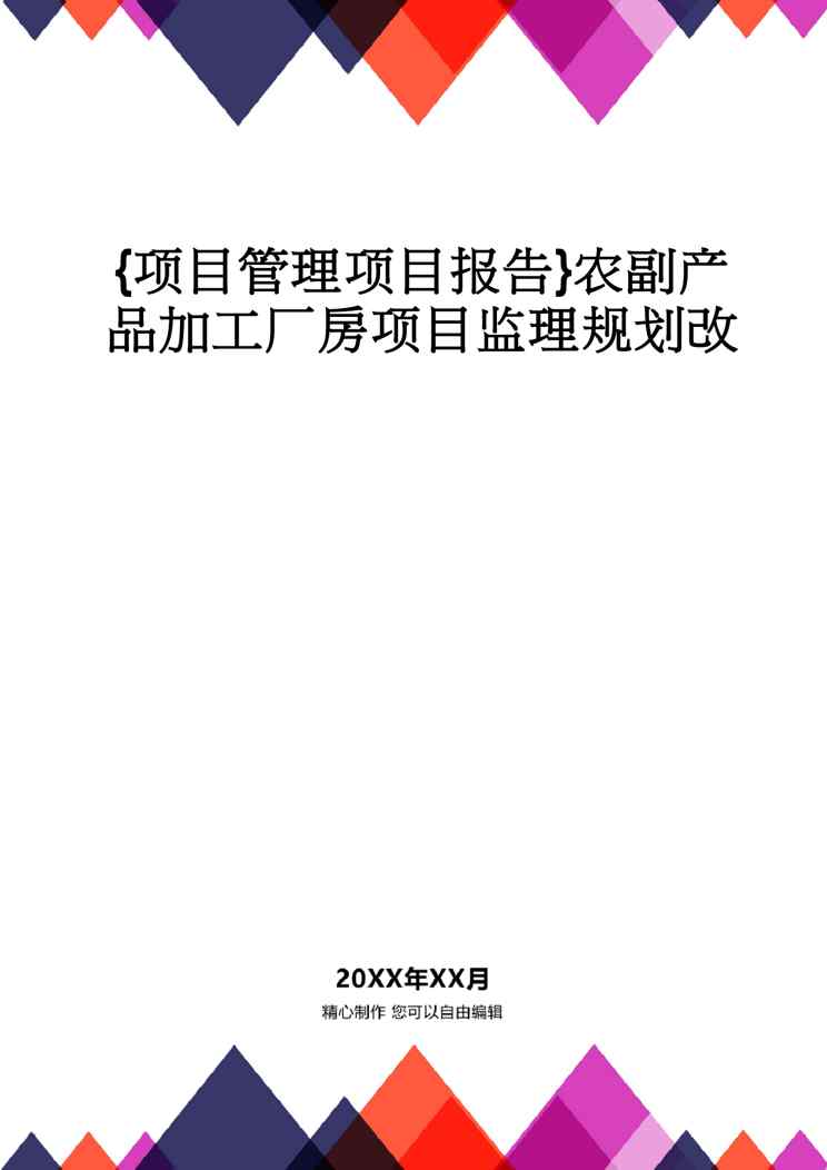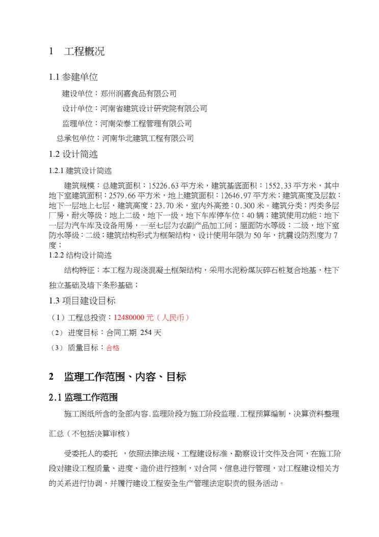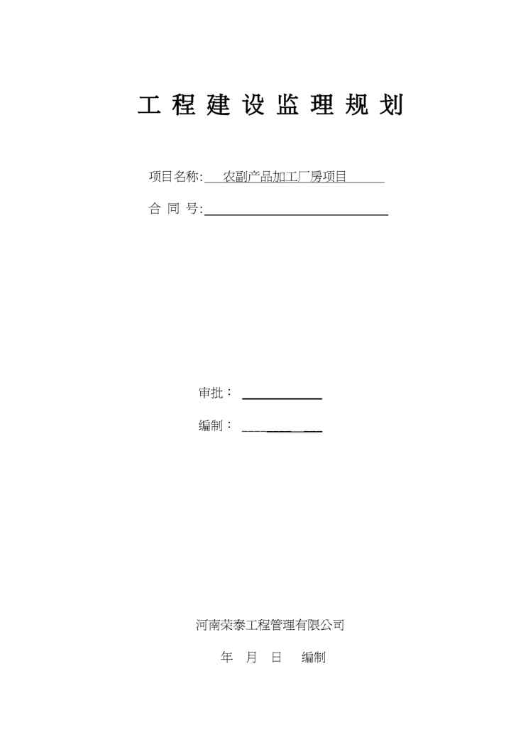 本站资深用户发布了最新的《{项目管理项目报告}农副产品加工厂房项目监理规划改》文档,以下内容为预览,详细内容可下载阅读。 声明:本站所有文章,如无特殊说明或标注,均为本站原创发布。任何个人或组织,在未征得本站同意时,禁止复制、盗用、采集、发布本站内容到任何网站、书籍等各类媒体平台。如若本站内容侵犯了原著者的合法权益,可联系我们进行处理。