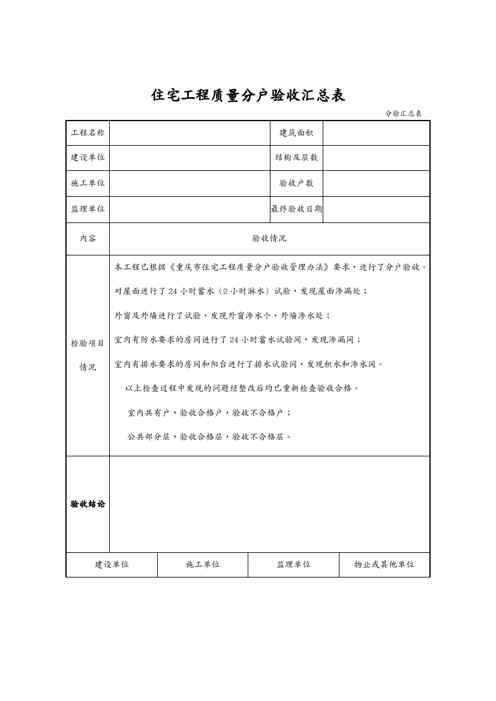 本站正式发布了《{品质管理制度表格}某某某年某市市住宅工程质量分户验收表格最新》文档,文档详细内容可下载阅读。 声明:本站所有文章,如无特殊说明或标注,均为本站原创发布。任何个人或组织,在未征得本站同意时,禁止复制、盗用、采集、发布本站内容到任何网站、书籍等各类媒体平台。如若本站内容侵犯了原著者的合法权益,可联系我们进行处理。
