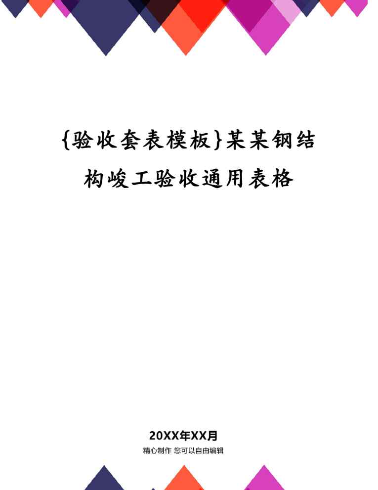 不久前,最新文档《{验收套表模板}某某钢结构峻工验收通用表格》全文正式在本站发布,感兴趣的用户可以下载阅读。 声明:本站所有文章,如无特殊说明或标注,均为本站原创发布。任何个人或组织,在未征得本站同意时,禁止复制、盗用、采集、发布本站内容到任何网站、书籍等各类媒体平台。如若本站内容侵犯了原著者的合法权益,可联系我们进行处理。