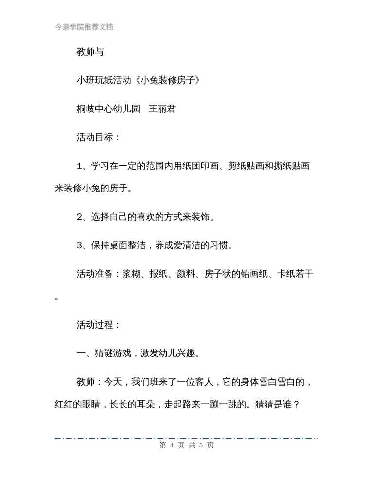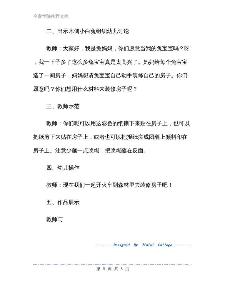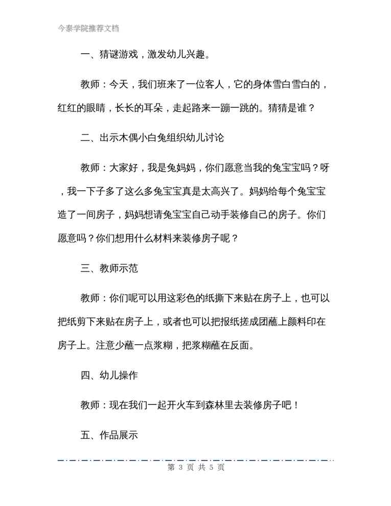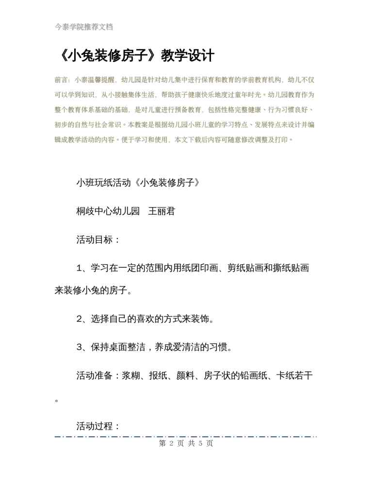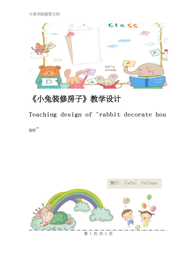 本站正式发布了《《小兔装修房子》教学设计》文档,文档详细内容可下载阅读。 声明:本站所有文章,如无特殊说明或标注,均为本站原创发布。任何个人或组织,在未征得本站同意时,禁止复制、盗用、采集、发布本站内容到任何网站、书籍等各类媒体平台。如若本站内容侵犯了原著者的合法权益,可联系我们进行处理。