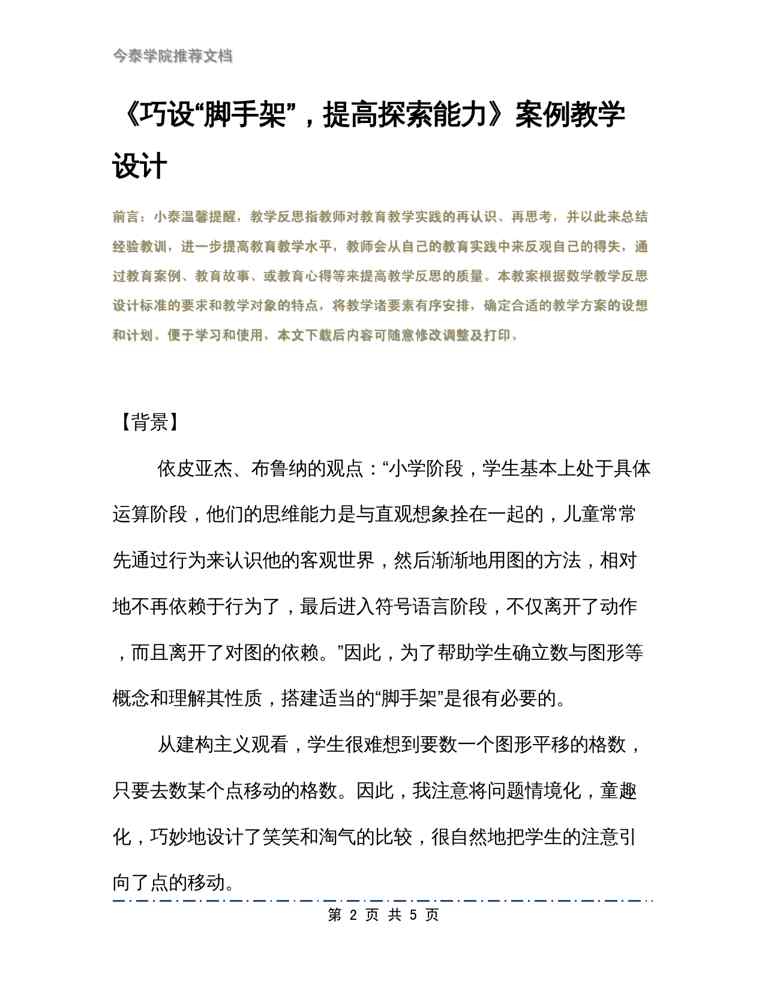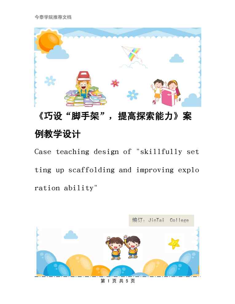 不久前,最新文档《《巧设“脚手架”,提高探索能力》案例教学设计》全文正式在本站发布,感兴趣的用户可以下载阅读。 声明:本站所有文章,如无特殊说明或标注,均为本站原创发布。任何个人或组织,在未征得本站同意时,禁止复制、盗用、采集、发布本站内容到任何网站、书籍等各类媒体平台。如若本站内容侵犯了原著者的合法权益,可联系我们进行处理。