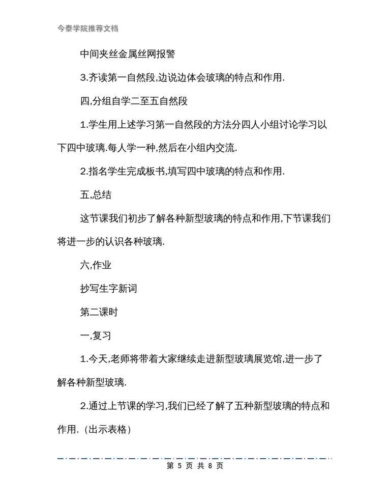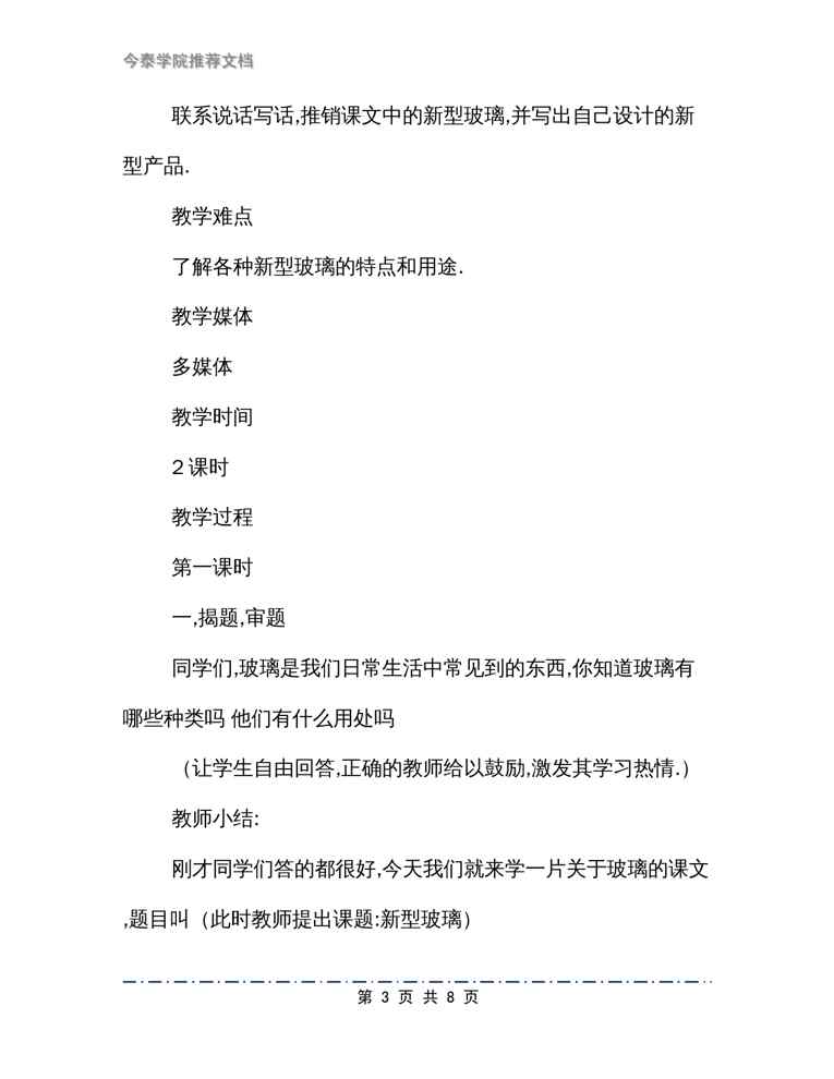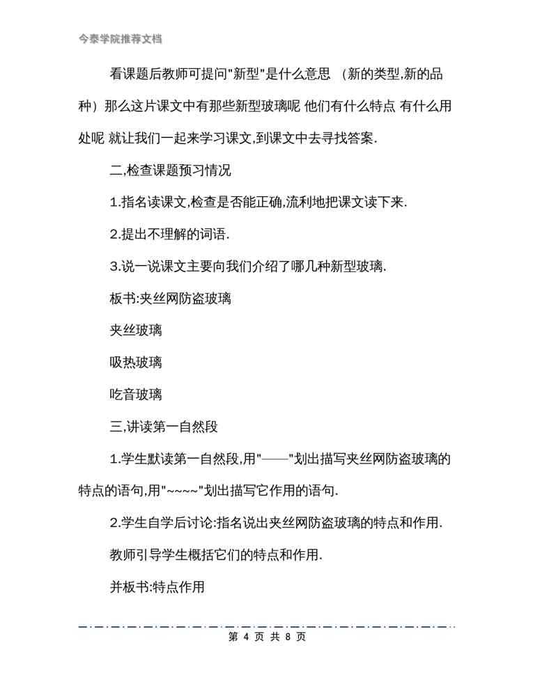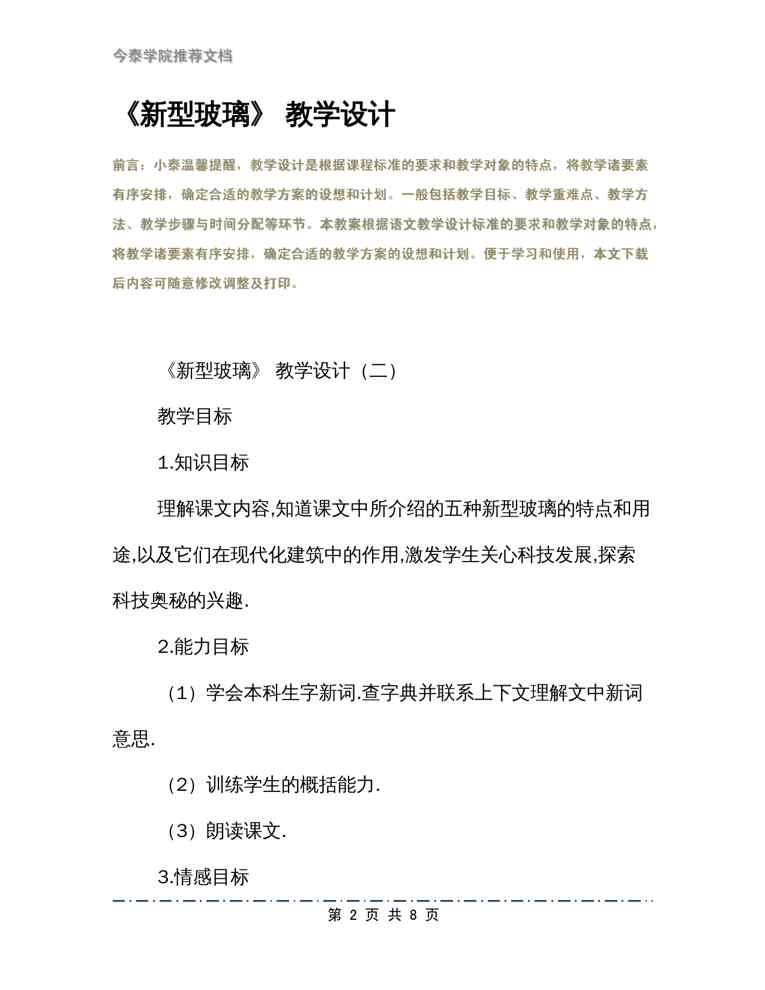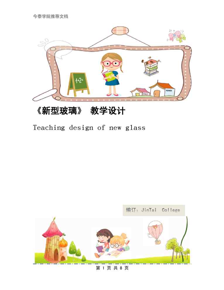 本站资深用户发布了最新的《《新型玻璃》 教学设计》文档,以下内容为预览,详细内容可下载阅读。 声明:本站所有文章,如无特殊说明或标注,均为本站原创发布。任何个人或组织,在未征得本站同意时,禁止复制、盗用、采集、发布本站内容到任何网站、书籍等各类媒体平台。如若本站内容侵犯了原著者的合法权益,可联系我们进行处理。