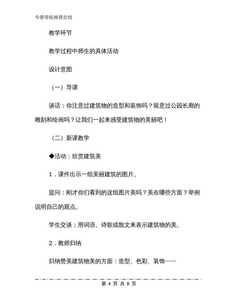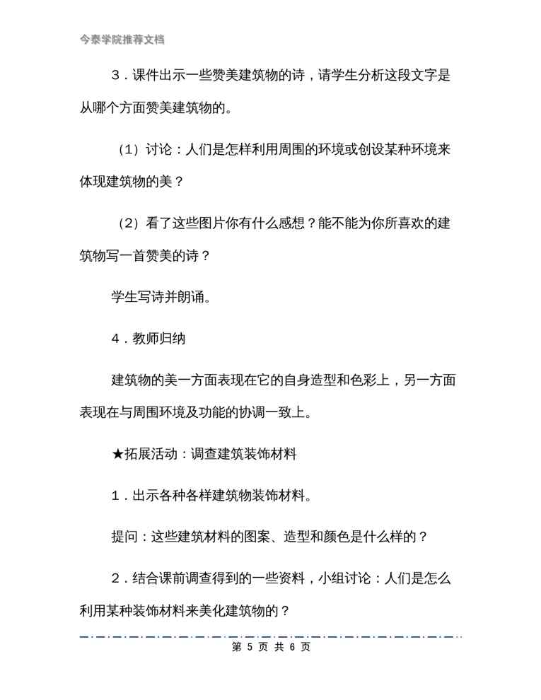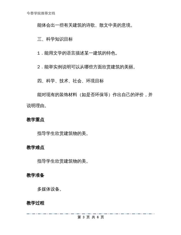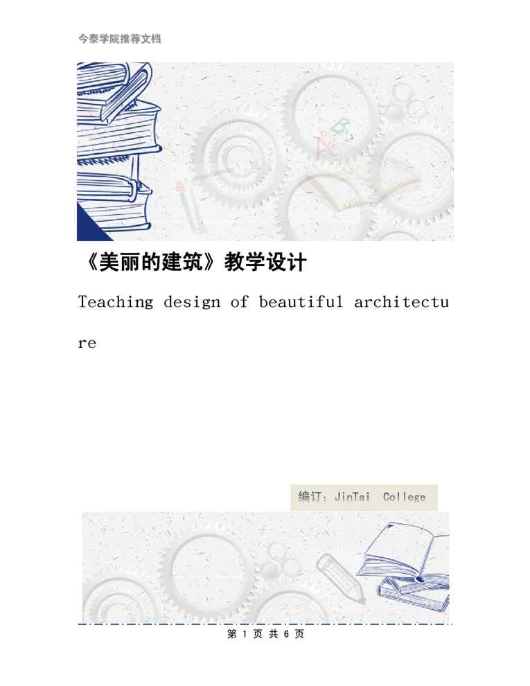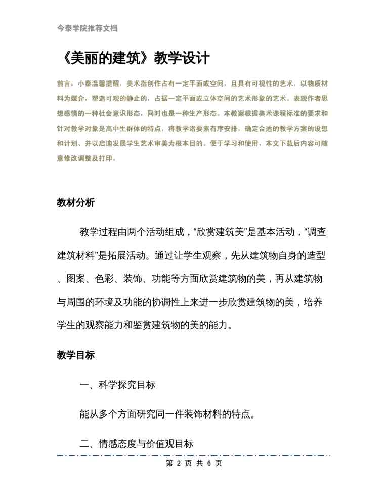 不久前,最新文档《《美丽的建筑》教学设计》全文正式在本站发布,感兴趣的用户可以下载阅读。 声明:本站所有文章,如无特殊说明或标注,均为本站原创发布。任何个人或组织,在未征得本站同意时,禁止复制、盗用、采集、发布本站内容到任何网站、书籍等各类媒体平台。如若本站内容侵犯了原著者的合法权益,可联系我们进行处理。