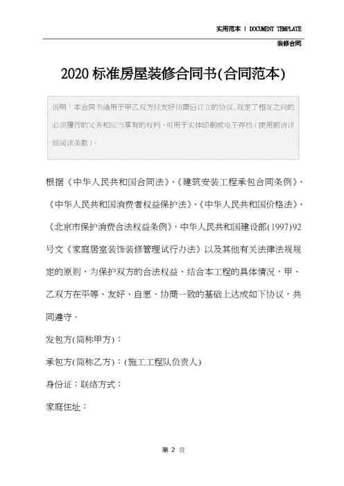 本站资深用户发布了最新的《2020标准房屋装修合同书(合同范本)》文档,以下内容为预览,详细内容可下载阅读。 声明:本站所有文章,如无特殊说明或标注,均为本站原创发布。任何个人或组织,在未征得本站同意时,禁止复制、盗用、采集、发布本站内容到任何网站、书籍等各类媒体平台。如若本站内容侵犯了原著者的合法权益,可联系我们进行处理。