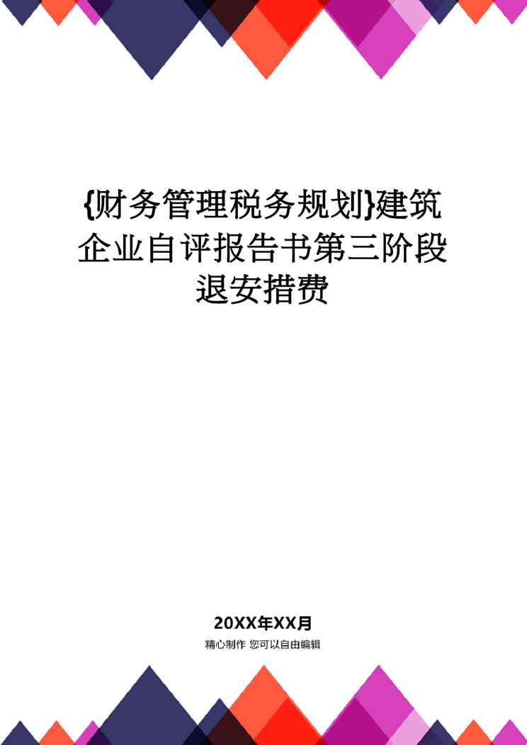 本站资深用户发布了最新的《【财务管理税务规划 】建筑企业自评报告书第三阶段退安措费》文档,以下内容为预览,详细内容可下载阅读。 声明:本站所有文章,如无特殊说明或标注,均为本站原创发布。任何个人或组织,在未征得本站同意时,禁止复制、盗用、采集、发布本站内容到任何网站、书籍等各类媒体平台。如若本站内容侵犯了原著者的合法权益,可联系我们进行处理。