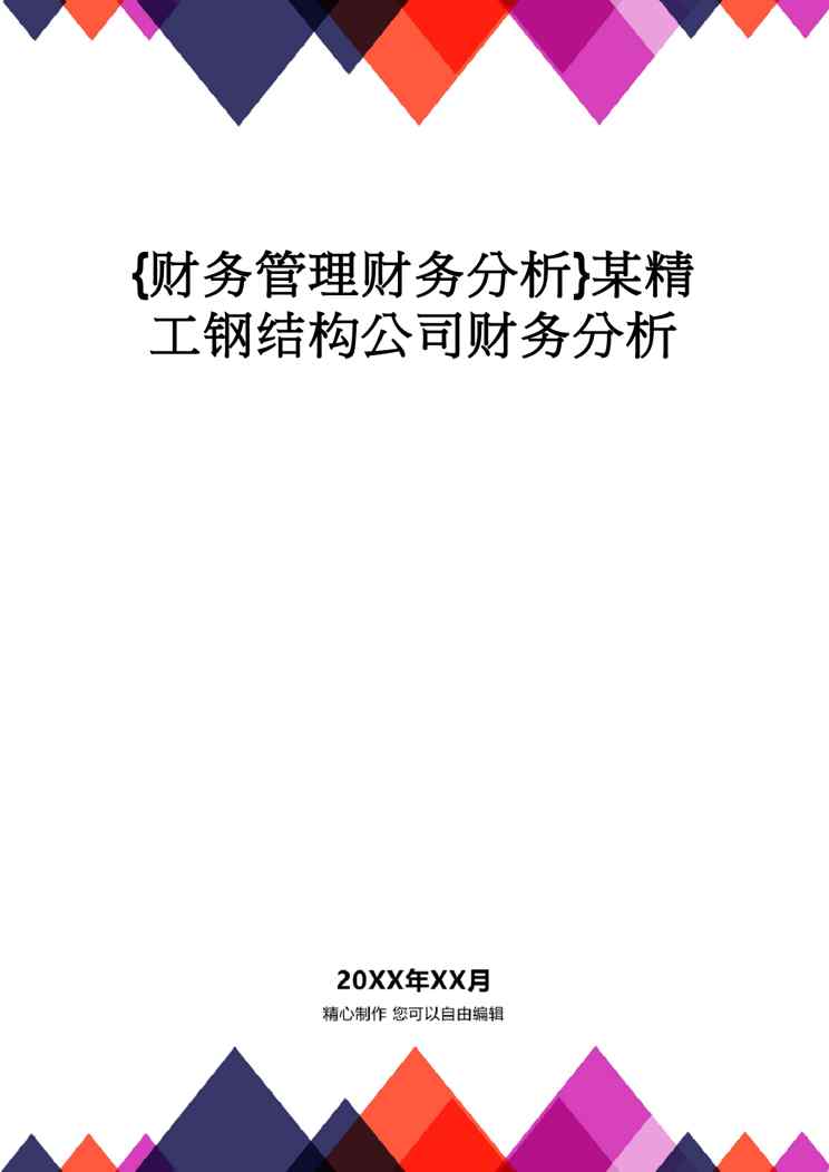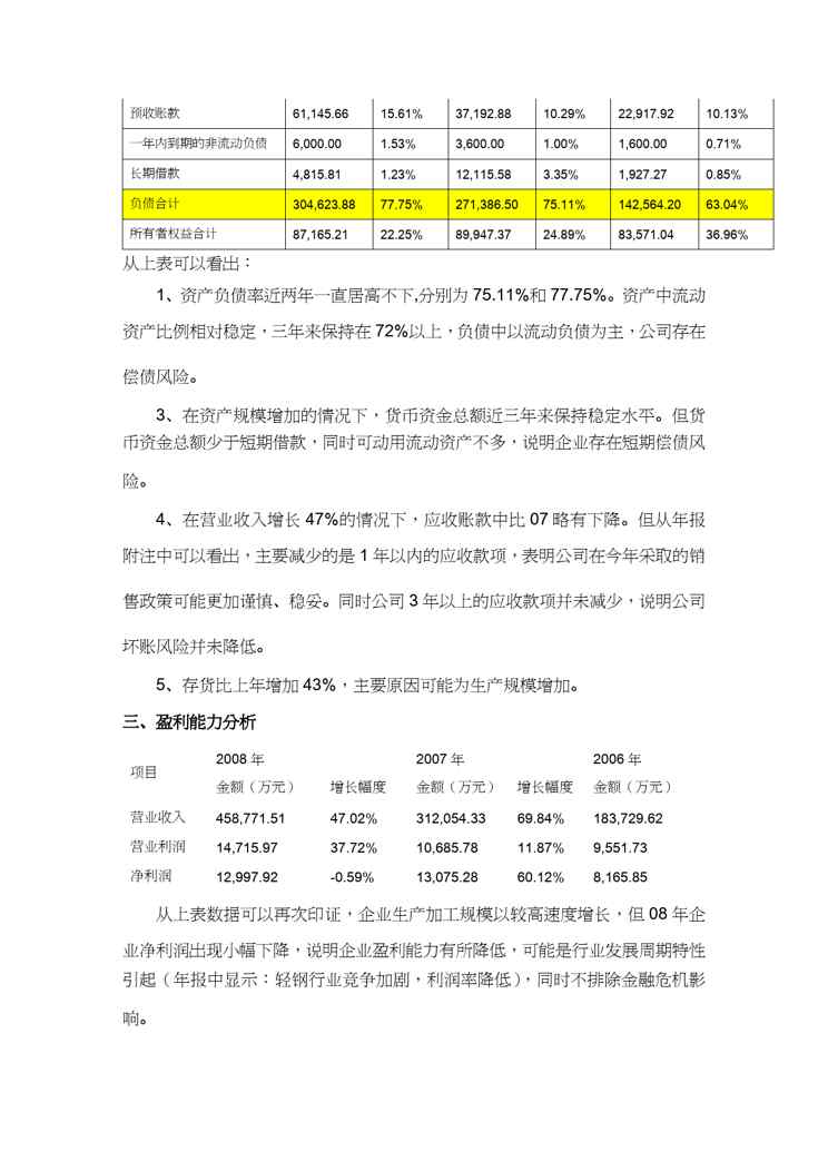 不久前,最新文档《【财务管理财务分析】 某精工钢结构公司财务分析》全文正式在本站发布,感兴趣的用户可以下载阅读。 声明:本站所有文章,如无特殊说明或标注,均为本站原创发布。任何个人或组织,在未征得本站同意时,禁止复制、盗用、采集、发布本站内容到任何网站、书籍等各类媒体平台。如若本站内容侵犯了原著者的合法权益,可联系我们进行处理。
