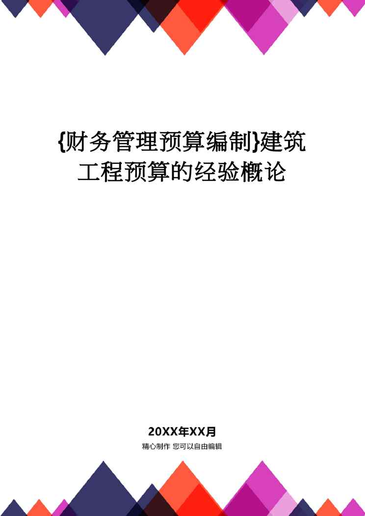 本站资深用户发布了最新的《【财务管理预算编制 】建筑工程预算的经验概论》文档,以下内容为预览,详细内容可下载阅读。 声明:本站所有文章,如无特殊说明或标注,均为本站原创发布。任何个人或组织,在未征得本站同意时,禁止复制、盗用、采集、发布本站内容到任何网站、书籍等各类媒体平台。如若本站内容侵犯了原著者的合法权益,可联系我们进行处理。