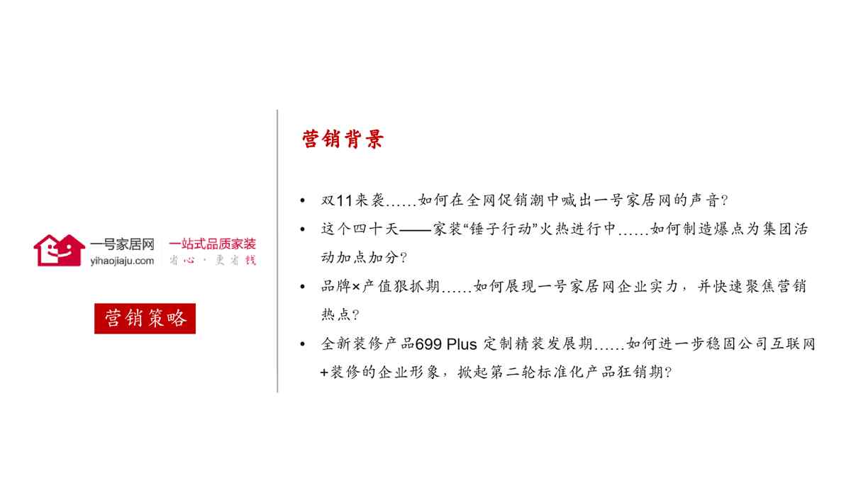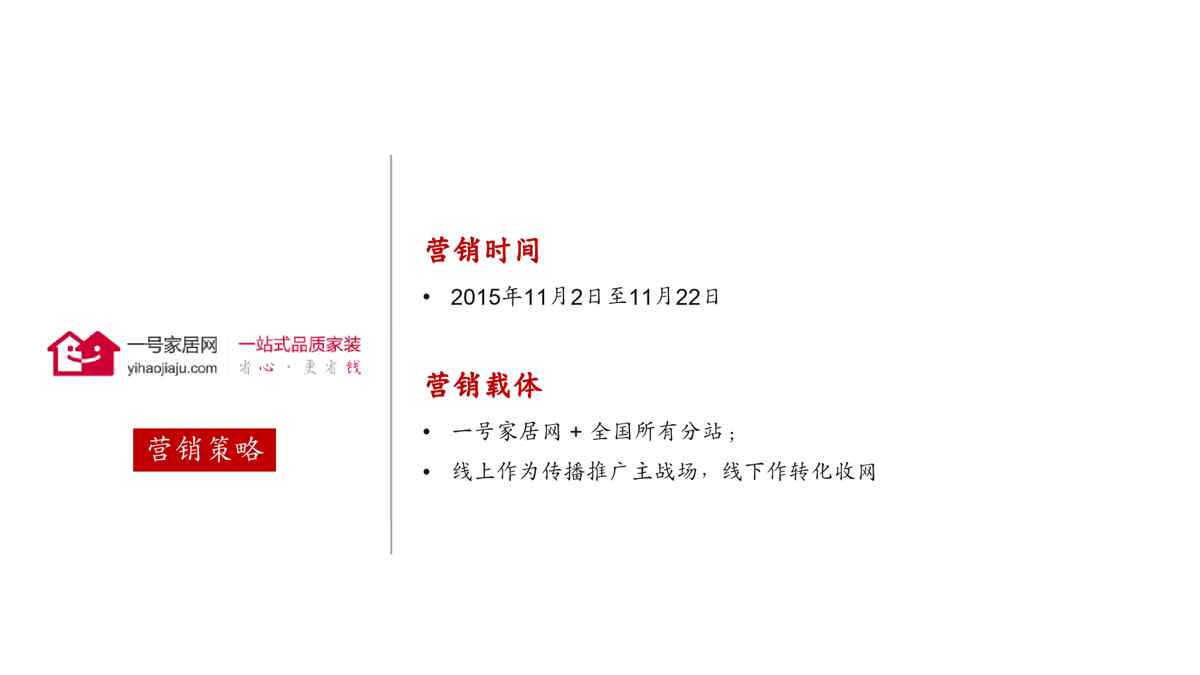 不久前,最新文档《一号家居网双11整合营销方案修正19》全文正式在本站发布,感兴趣的用户可以下载阅读。 声明:本站所有文章,如无特殊说明或标注,均为本站原创发布。任何个人或组织,在未征得本站同意时,禁止复制、盗用、采集、发布本站内容到任何网站、书籍等各类媒体平台。如若本站内容侵犯了原著者的合法权益,可联系我们进行处理。