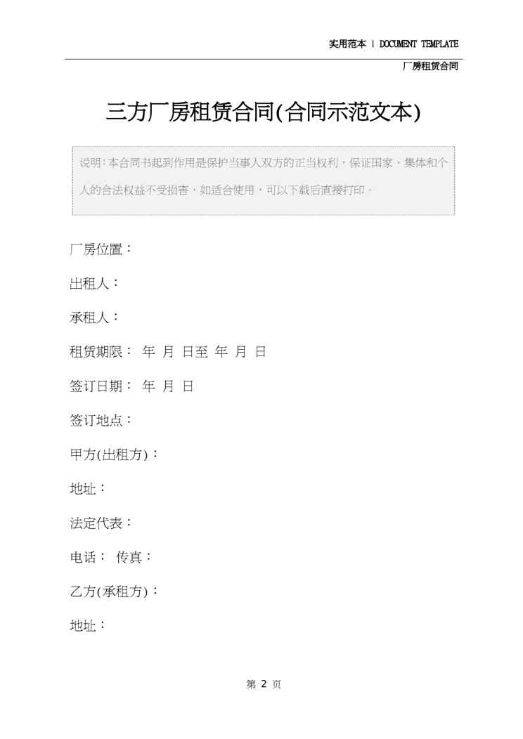 本站资深用户发布了最新的《三方厂房租赁合同通用版》文档,以下内容为预览,详细内容可下载阅读。 声明:本站所有文章,如无特殊说明或标注,均为本站原创发布。任何个人或组织,在未征得本站同意时,禁止复制、盗用、采集、发布本站内容到任何网站、书籍等各类媒体平台。如若本站内容侵犯了原著者的合法权益,可联系我们进行处理。