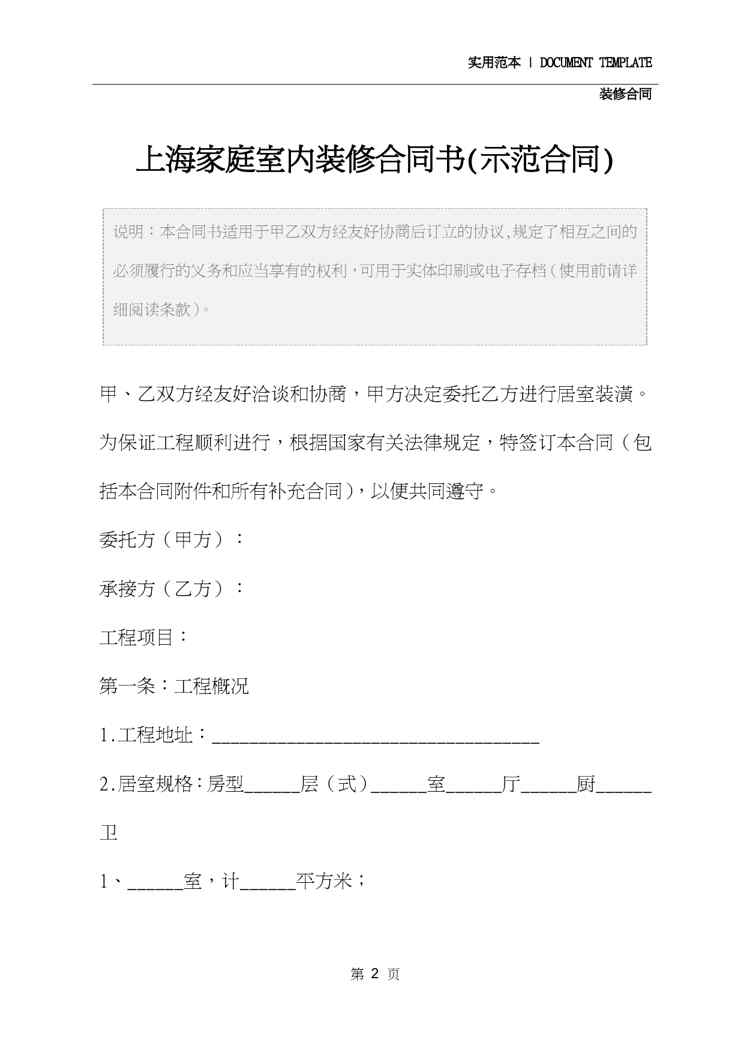 本站正式发布了《上海家庭室内装修合同书(示范合同)》文档,文档详细内容可下载阅读。 声明:本站所有文章,如无特殊说明或标注,均为本站原创发布。任何个人或组织,在未征得本站同意时,禁止复制、盗用、采集、发布本站内容到任何网站、书籍等各类媒体平台。如若本站内容侵犯了原著者的合法权益,可联系我们进行处理。