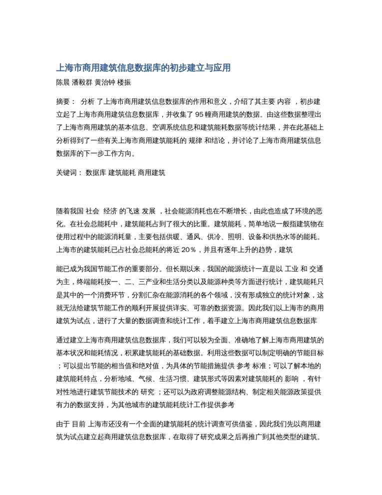 不久前,最新文档《上海市商用建筑信息数据库的初步建立与应用》全文正式在本站发布,感兴趣的用户可以下载阅读。 声明:本站所有文章,如无特殊说明或标注,均为本站原创发布。任何个人或组织,在未征得本站同意时,禁止复制、盗用、采集、发布本站内容到任何网站、书籍等各类媒体平台。如若本站内容侵犯了原著者的合法权益,可联系我们进行处理。