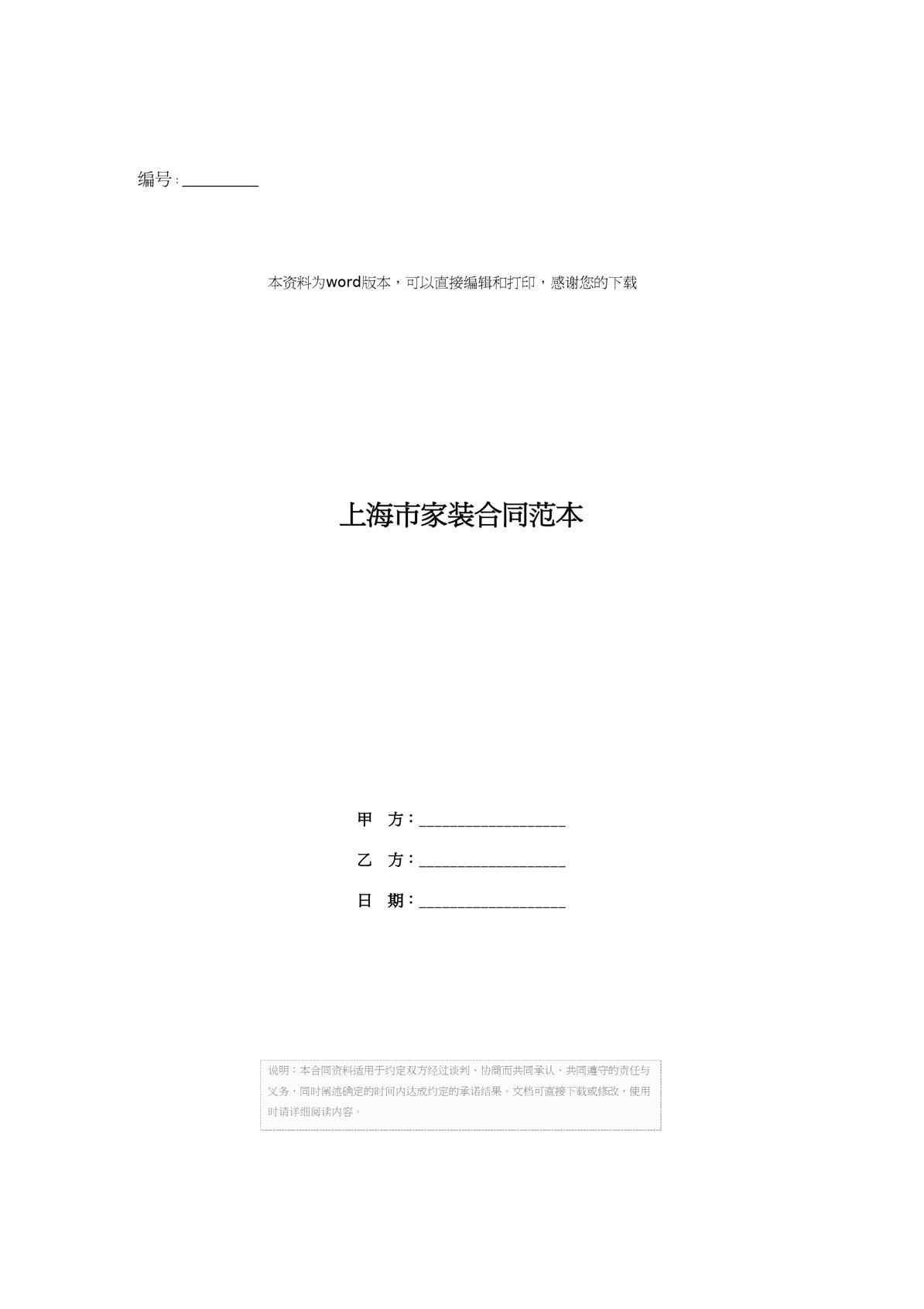 不久前,最新文档《上海市家装合同范本》全文正式在本站发布,感兴趣的用户可以下载阅读。 声明:本站所有文章,如无特殊说明或标注,均为本站原创发布。任何个人或组织,在未征得本站同意时,禁止复制、盗用、采集、发布本站内容到任何网站、书籍等各类媒体平台。如若本站内容侵犯了原著者的合法权益,可联系我们进行处理。