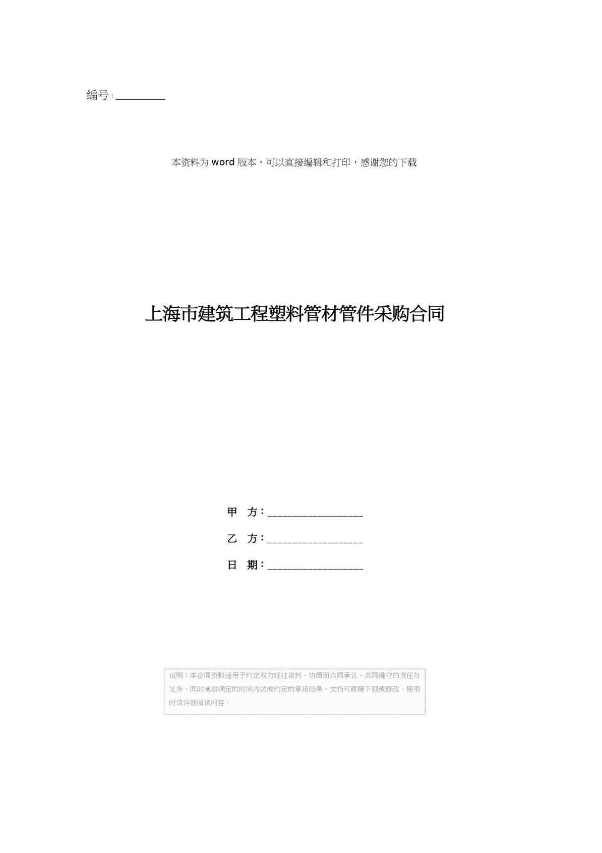 本站正式发布了《上海市建筑工程塑料管材管件采购合同》文档,文档详细内容可下载阅读。 声明:本站所有文章,如无特殊说明或标注,均为本站原创发布。任何个人或组织,在未征得本站同意时,禁止复制、盗用、采集、发布本站内容到任何网站、书籍等各类媒体平台。如若本站内容侵犯了原著者的合法权益,可联系我们进行处理。
