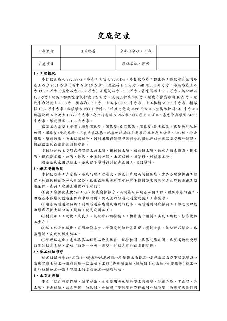 不久前,最新文档《(技术套表)路基技术交底表格》全文正式在本站发布,感兴趣的用户可以下载阅读。 声明:本站所有文章,如无特殊说明或标注,均为本站原创发布。任何个人或组织,在未征得本站同意时,禁止复制、盗用、采集、发布本站内容到任何网站、书籍等各类媒体平台。如若本站内容侵犯了原著者的合法权益,可联系我们进行处理。