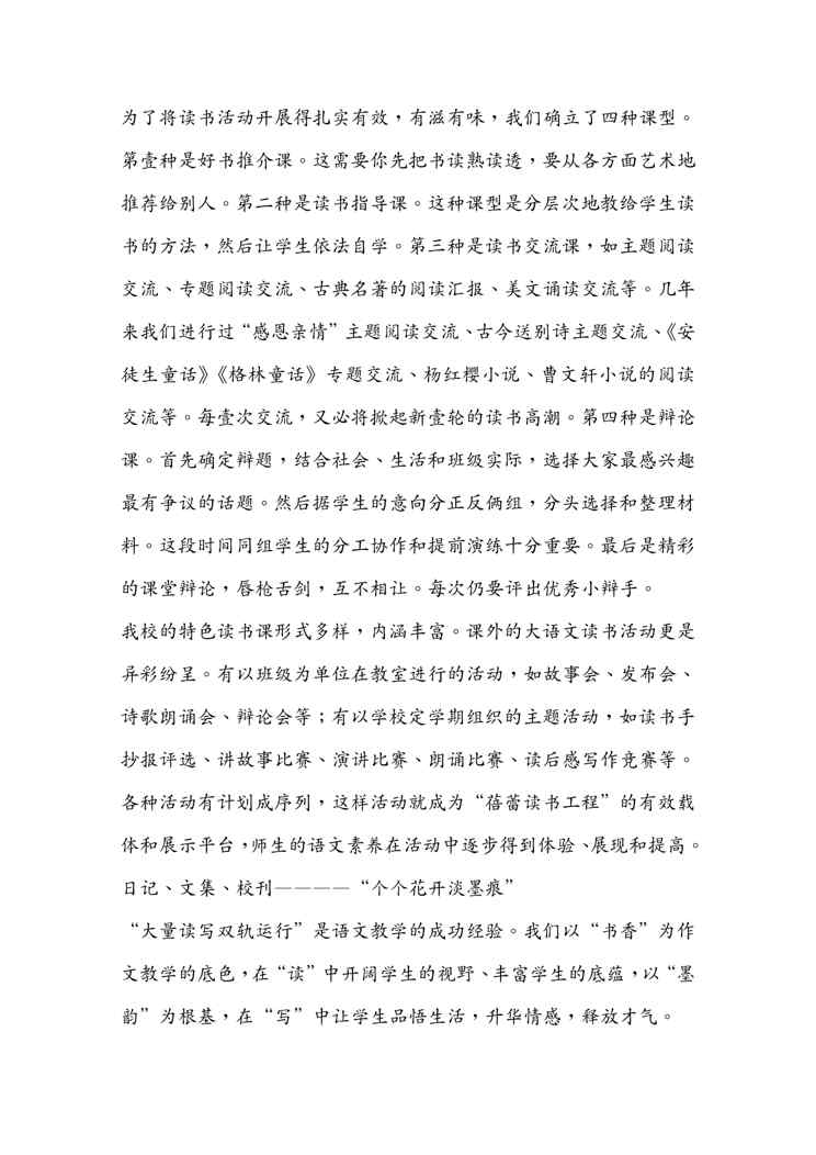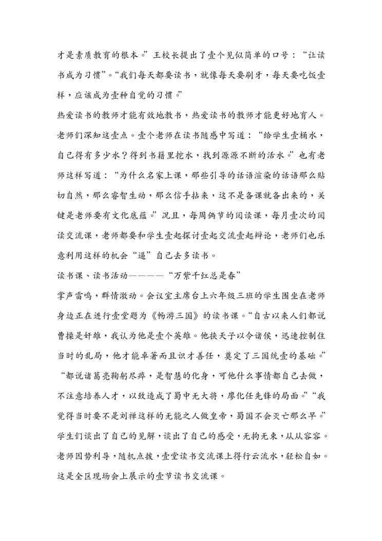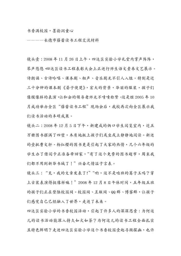 本站资深用户发布了最新的《(建筑工程管理)长德市蓓蕾读书工程交流材料》文档,以下内容为预览,详细内容可下载阅读。 声明:本站所有文章,如无特殊说明或标注,均为本站原创发布。任何个人或组织,在未征得本站同意时,禁止复制、盗用、采集、发布本站内容到任何网站、书籍等各类媒体平台。如若本站内容侵犯了原著者的合法权益,可联系我们进行处理。