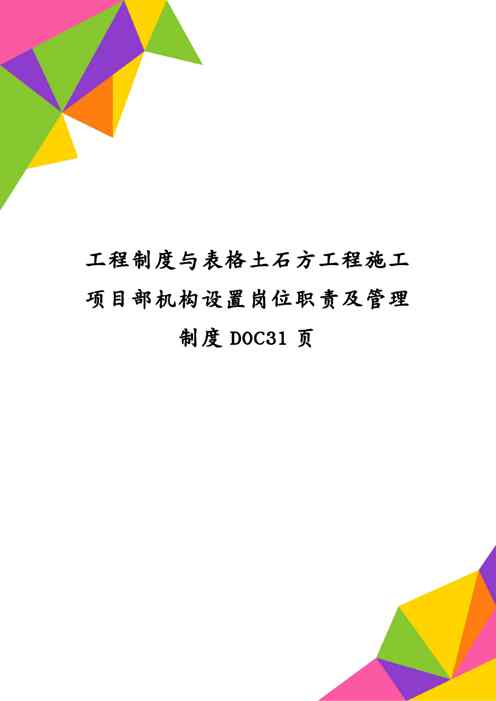 不久前,最新文档《工程制度与表格土石方工程施工项目部机构设置岗位职责及管理制度DOC31页》全文正式在本站发布,感兴趣的用户可以下载阅读。 声明:本站所有文章,如无特殊说明或标注,均为本站原创发布。任何个人或组织,在未征得本站同意时,禁止复制、盗用、采集、发布本站内容到任何网站、书籍等各类媒体平台。如若本站内容侵犯了原著者的合法权益,可联系我们进行处理。