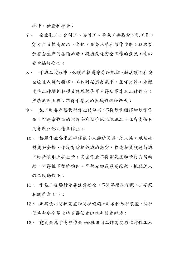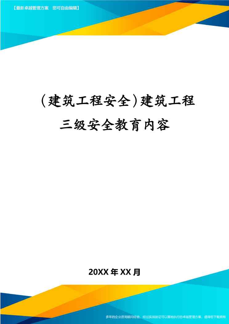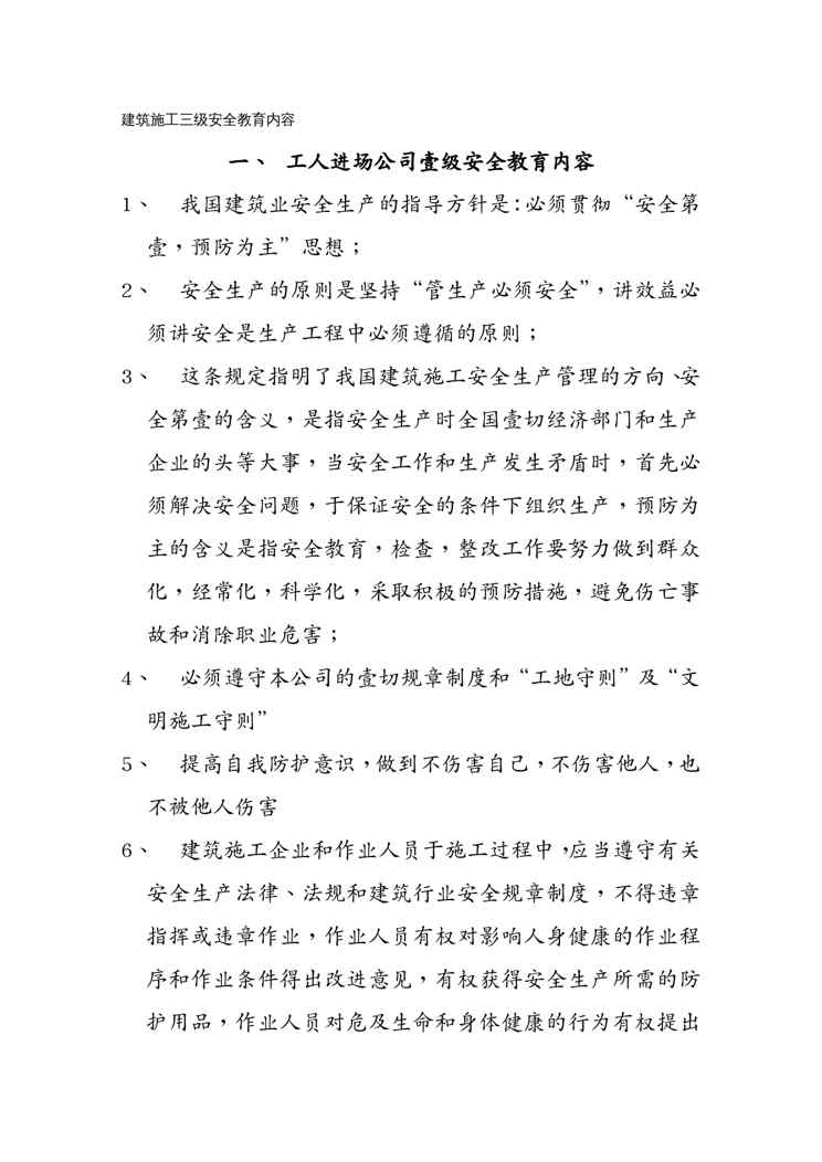 本站资深用户发布了最新的《(建筑工程安全)建筑工程三级安全教育内容》文档,以下内容为预览,详细内容可下载阅读。 声明:本站所有文章,如无特殊说明或标注,均为本站原创发布。任何个人或组织,在未征得本站同意时,禁止复制、盗用、采集、发布本站内容到任何网站、书籍等各类媒体平台。如若本站内容侵犯了原著者的合法权益,可联系我们进行处理。