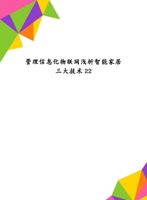 不久前,最新文档《管理信息化物联网浅析智能家居三大技术22》全文正式在本站发布,感兴趣的用户可以下载阅读。 声明:本站所有文章,如无特殊说明或标注,均为本站原创发布。任何个人或组织,在未征得本站同意时,禁止复制、盗用、采集、发布本站内容到任何网站、书籍等各类媒体平台。如若本站内容侵犯了原著者的合法权益,可联系我们进行处理。