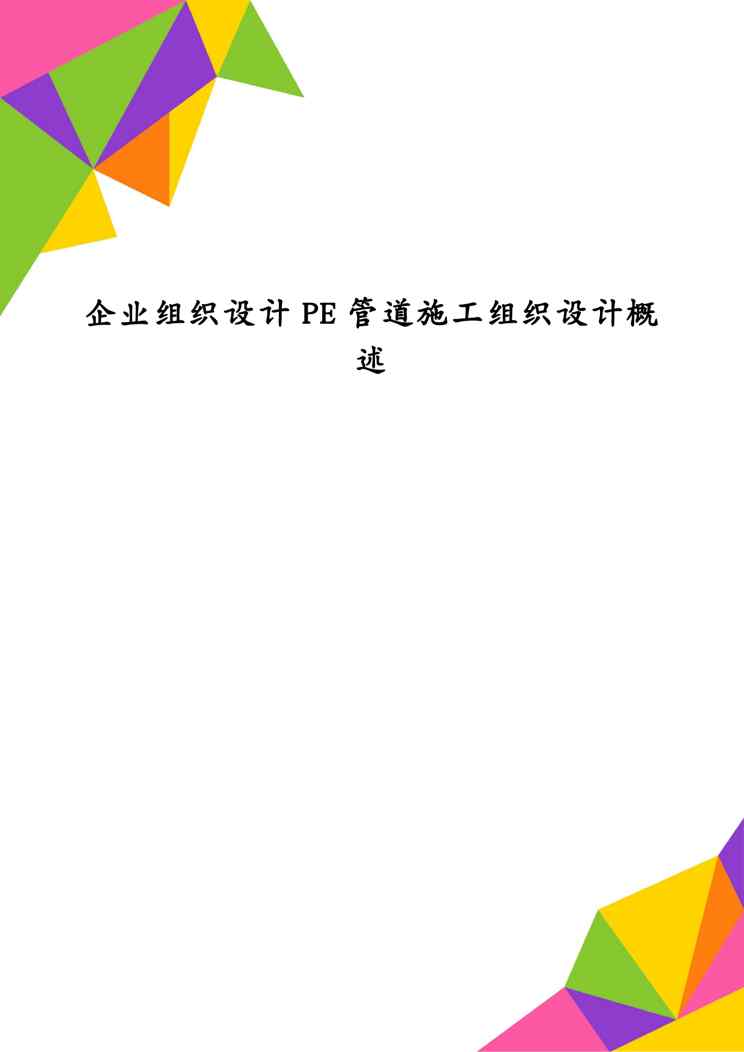 不久前,最新文档《企业组织设计PE管道施工组织设计概述》全文正式在本站发布,感兴趣的用户可以下载阅读。 声明:本站所有文章,如无特殊说明或标注,均为本站原创发布。任何个人或组织,在未征得本站同意时,禁止复制、盗用、采集、发布本站内容到任何网站、书籍等各类媒体平台。如若本站内容侵犯了原著者的合法权益,可联系我们进行处理。