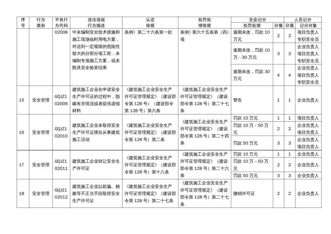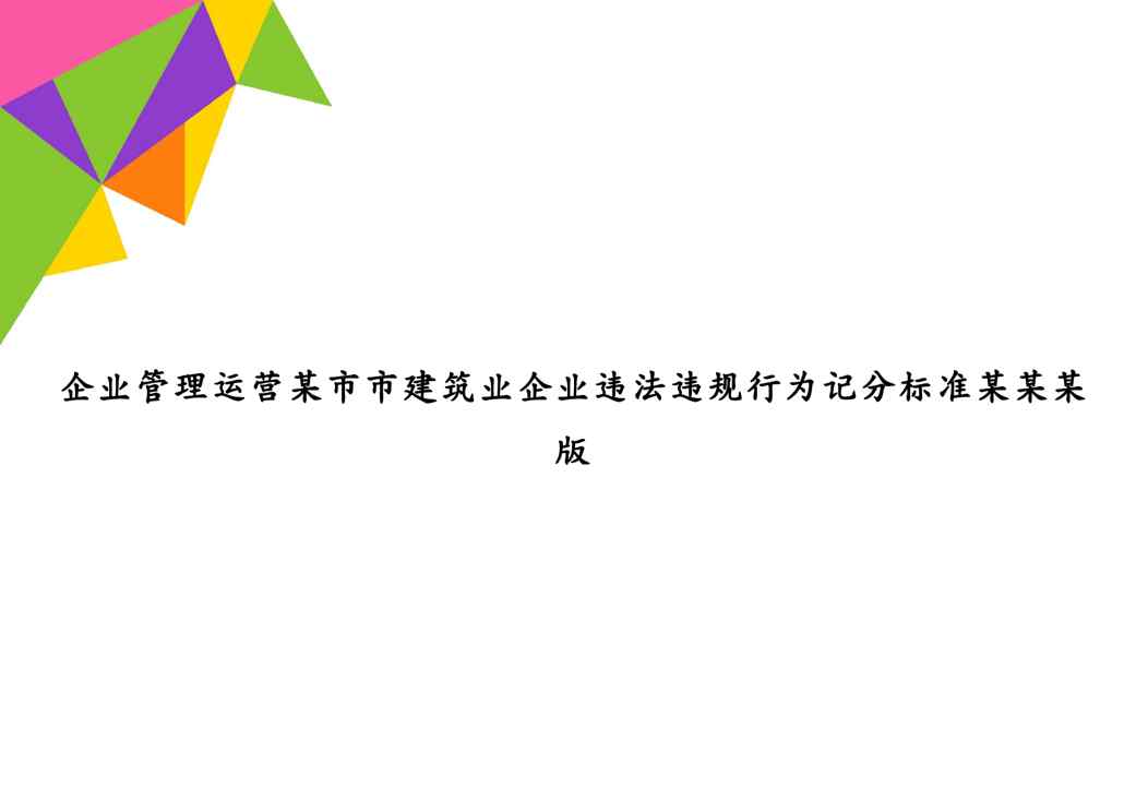 本站资深用户发布了最新的《企业管理运营某市市建筑业企业违法违规行为记分标准某某某版》文档,以下内容为预览,详细内容可下载阅读。 声明:本站所有文章,如无特殊说明或标注,均为本站原创发布。任何个人或组织,在未征得本站同意时,禁止复制、盗用、采集、发布本站内容到任何网站、书籍等各类媒体平台。如若本站内容侵犯了原著者的合法权益,可联系我们进行处理。