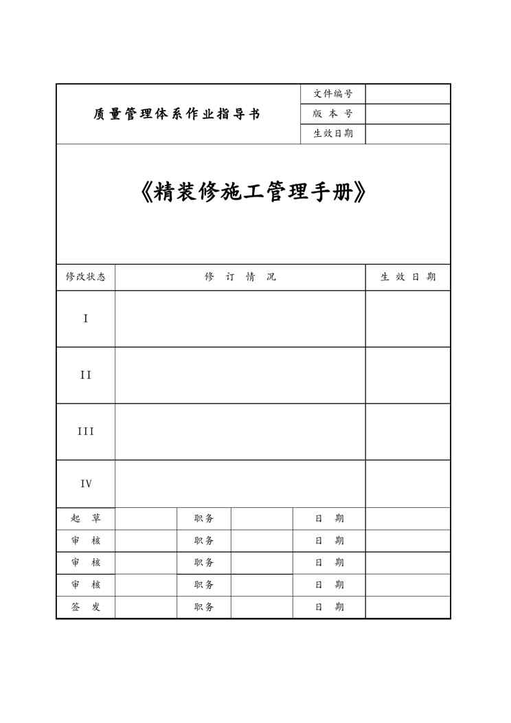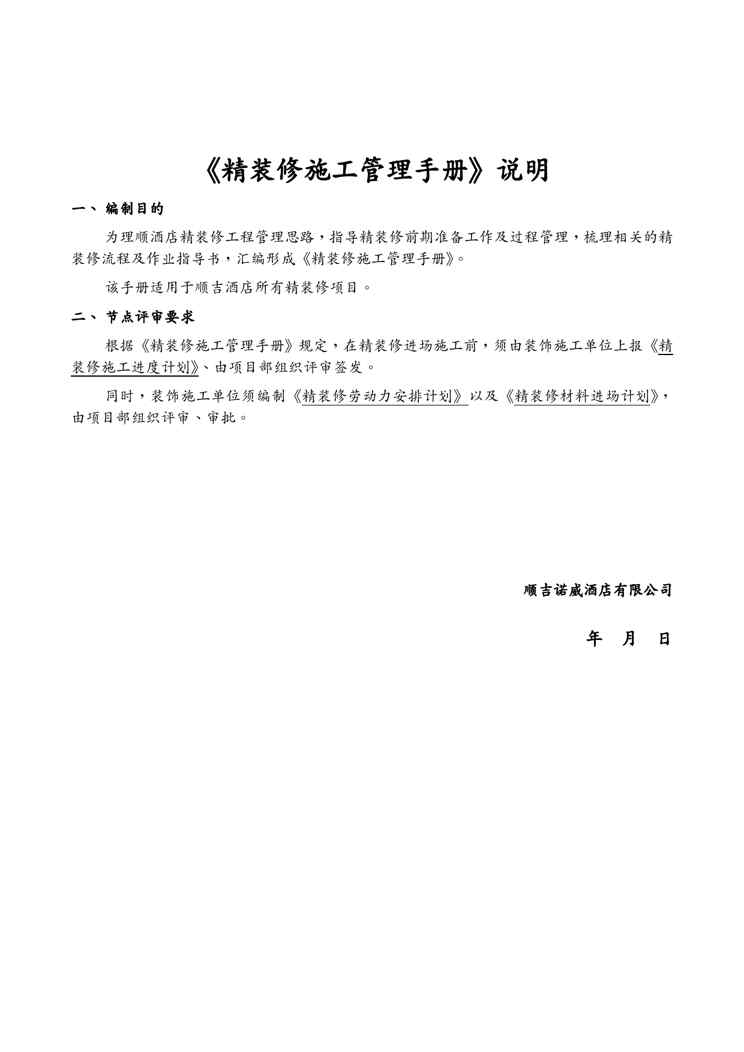 本站资深用户发布了最新的《企业管理手册酒店精装修施工管理手册版》文档,以下内容为预览,详细内容可下载阅读。 声明:本站所有文章,如无特殊说明或标注,均为本站原创发布。任何个人或组织,在未征得本站同意时,禁止复制、盗用、采集、发布本站内容到任何网站、书籍等各类媒体平台。如若本站内容侵犯了原著者的合法权益,可联系我们进行处理。