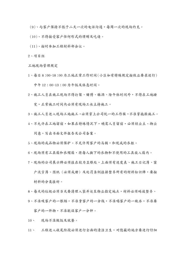 本站资深用户发布了最新的《企业管理手册装饰公司(家装)项目经理手册》文档,以下内容为预览,详细内容可下载阅读。 声明:本站所有文章,如无特殊说明或标注,均为本站原创发布。任何个人或组织,在未征得本站同意时,禁止复制、盗用、采集、发布本站内容到任何网站、书籍等各类媒体平台。如若本站内容侵犯了原著者的合法权益,可联系我们进行处理。
